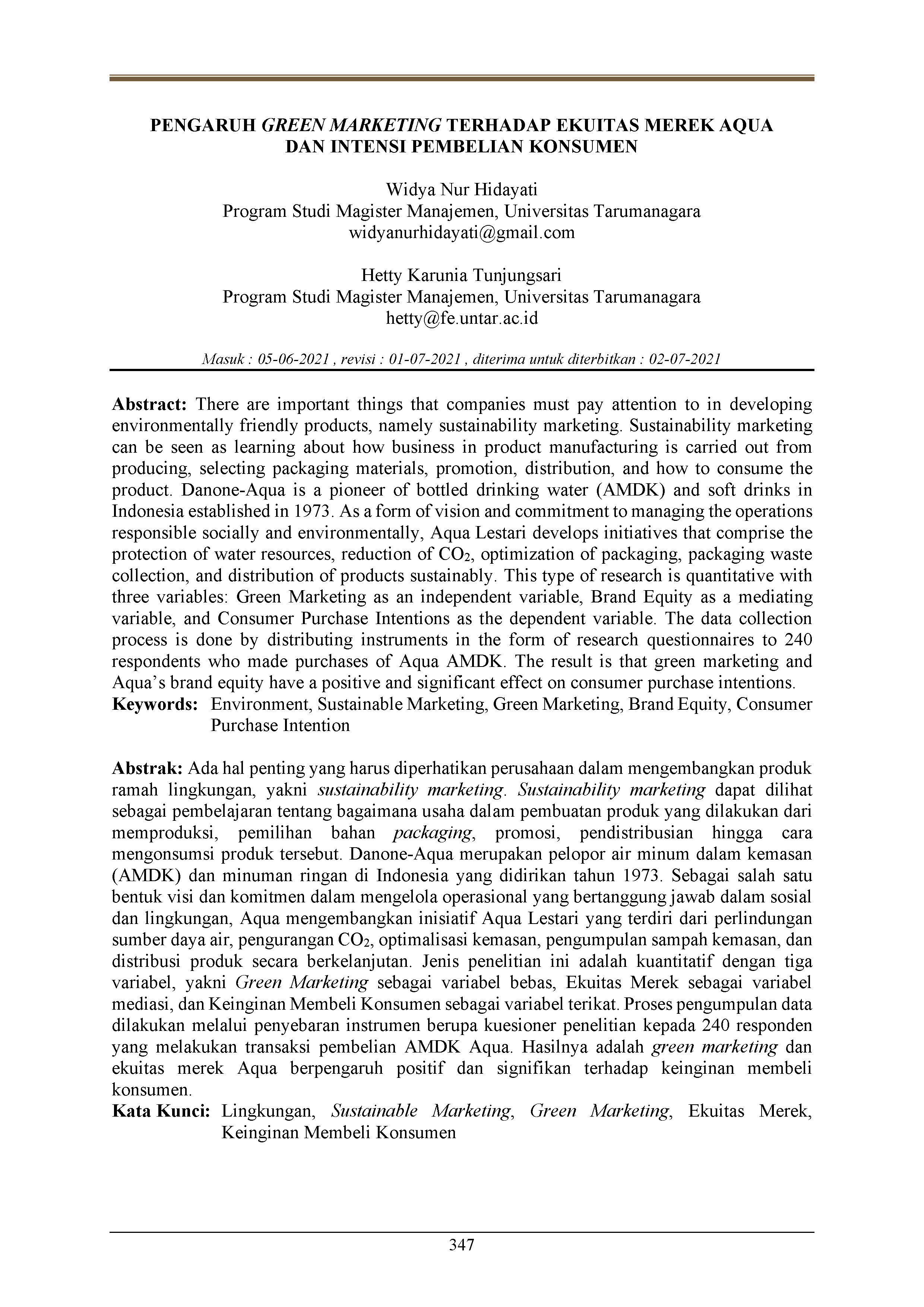 Pengaruh Green Marketing terhadap Ekuitas Merek Aqua dan Intensi Pembelian Konsumen