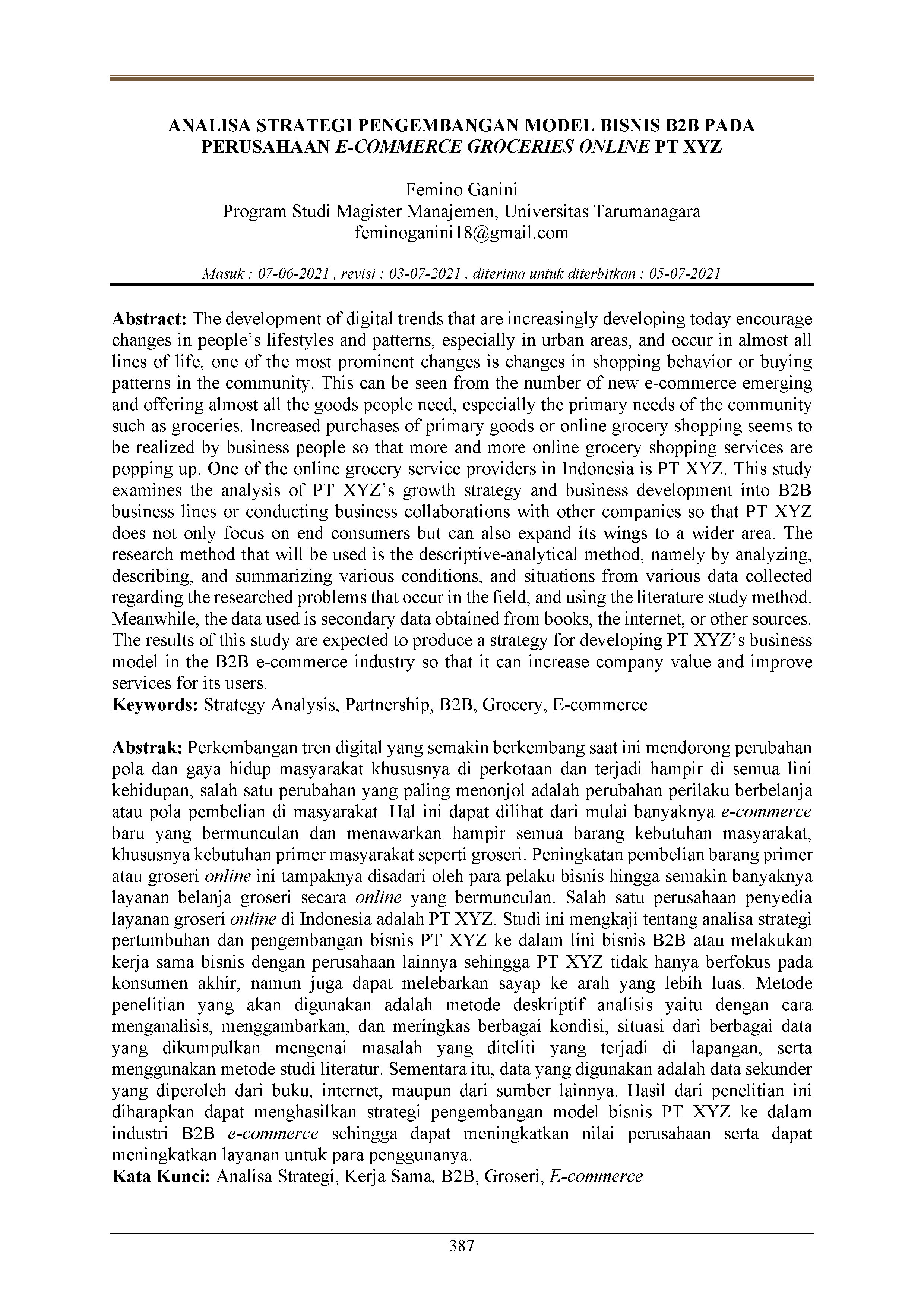 Perkembangan tren digital yang semakin berkembang saat ini mendorong perubahan pola dan gaya hidup masyarakat khususnya di perkotaan dan terjadi hampir di semua lini kehidupan, salah satu perubahan yang paling menonjol adalah perubahan perilaku berbelanja atau pola pembelian di masyarakat. Hal ini dapat dilihat dari mulai banyaknya e-commerce baru yang bermunculan dan menawarkan hampir semua barang kebutuhan masyarakat, khususnya kebutuhan primer masyarakat seperti groseri. Peningkatan pembelian barang primer atau groseri online ini tampaknya disadari oleh para pelaku bisnis hingga semakin banyaknya layanan belanja groseri secara online yang bermunculan. Salah satu perusahaan penyedia layanan groseri online di Indonesia adalah PT XYZ. Studi ini mengkaji tentang analisa strategi pertumbuhan dan pengembangan bisnis PT XYZ ke dalam lini bisnis B2B atau melakukan kerja sama bisnis dengan perusahaan lainnya sehingga PT XYZ tidak hanya berfokus pada konsumen akhir, namun juga dapat melebarkan sayap ke arah yang lebih luas. Metode penelitian yang akan digunakan adalah metode deskriptif analisis yaitu dengan cara menganalisis, menggambarkan, dan meringkas berbagai kondisi, situasi dari berbagai data yang dikumpulkan mengenai masalah yang diteliti yang terjadi di lapangan, serta menggunakan metode studi literatur. Sementara itu, data yang digunakan adalah data sekunder yang diperoleh dari buku, internet, maupun dari sumber lainnya. Hasil dari penelitian ini diharapkan dapat menghasilkan strategi pengembangan model bisnis PT XYZ ke dalam industri B2B e-commerce sehingga dapat meningkatkan nilai perusahaan serta dapat meningkatkan layanan untuk para penggunanya.