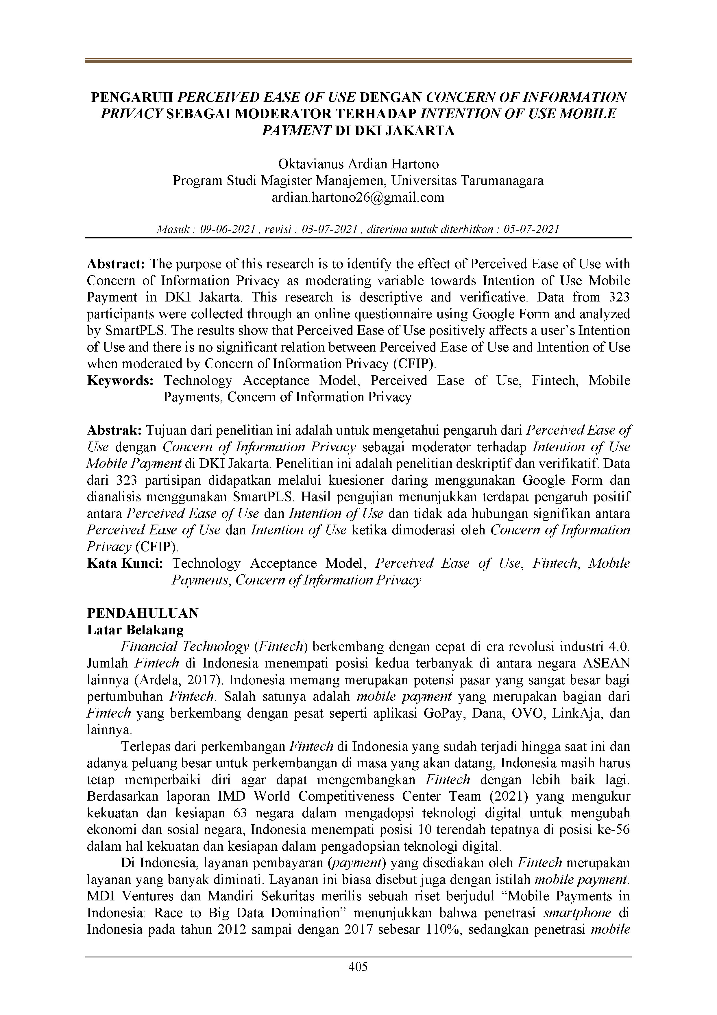 Pengaruh Perceived Ease of Use dengan Concern of Information Privacy sebagai Moderator terhadap Intention of Use Mobile Payment di DKI Jakarta