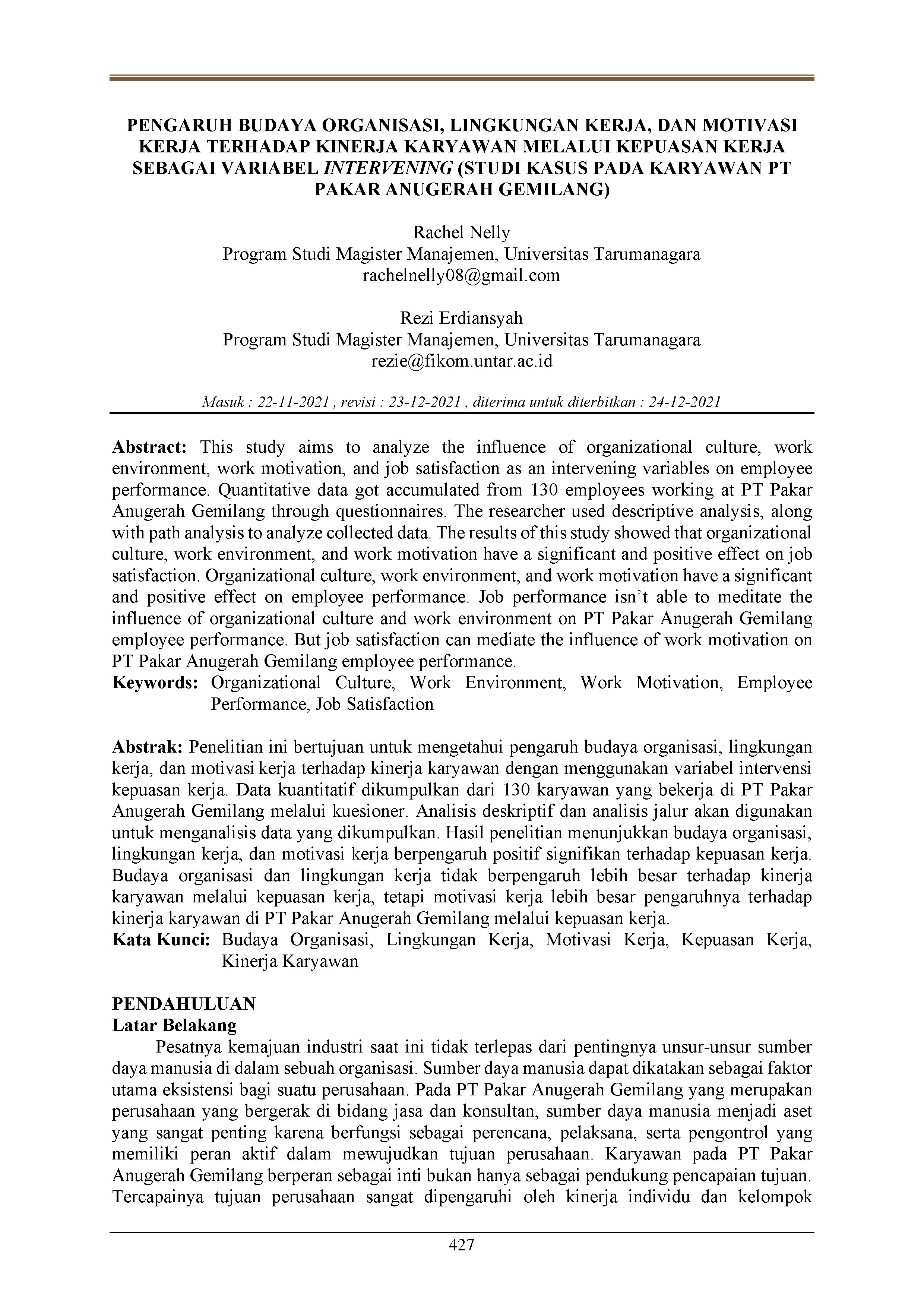 Pengaruh Budaya Organisasi, Lingkungan Kerja, dan Motivasi Kerja terhadap Kinerja Karyawan melalui Kepuasan Kerja sebagai Variabel Intervening (Studi Kasus pada Karyawan PT Pakar Anugerah Gemilang)