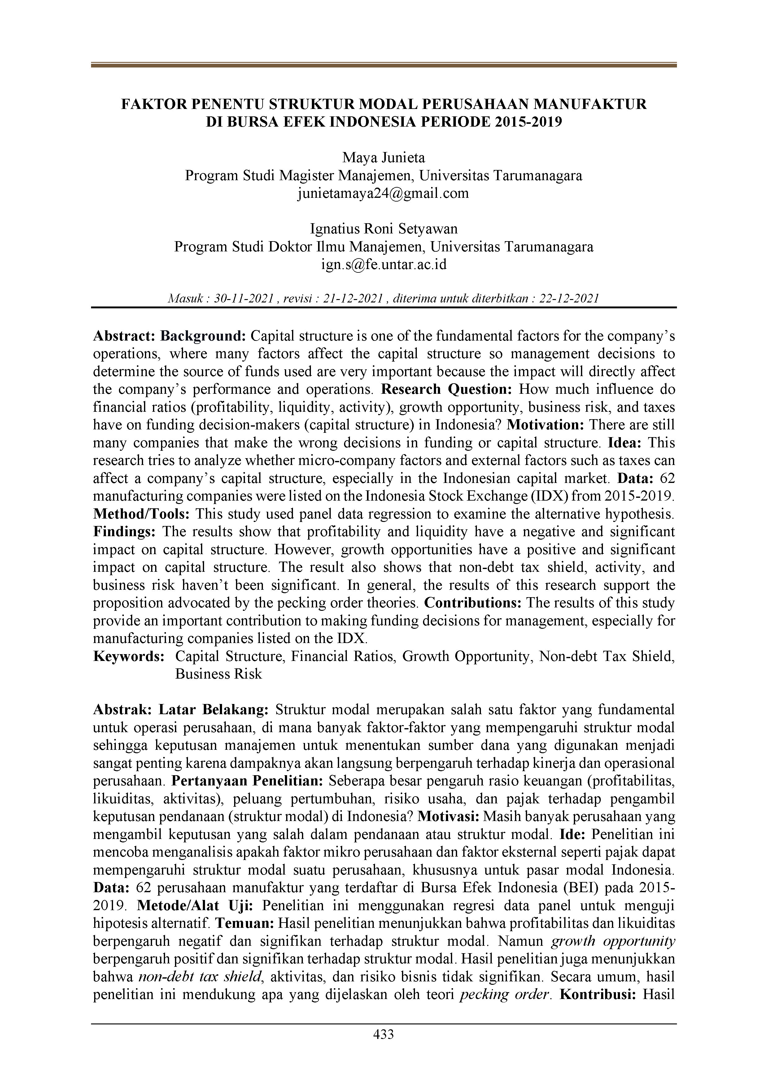 Latar Belakang: Struktur modal merupakan salah satu faktor yang fundamental untuk operasi perusahaan, di mana banyak faktor-faktor yang mempengaruhi struktur modal sehingga keputusan manajemen untuk menentukan sumber dana yang digunakan menjadi sangat penting karena dampaknya akan langsung berpengaruh terhadap kinerja dan operasional perusahaan. Pertanyaan Penelitian: Seberapa besar pengaruh rasio keuangan (profitabilitas, likuiditas, aktivitas), peluang pertumbuhan, risiko usaha, dan pajak terhadap pengambil keputusan pendanaan (struktur modal) di Indonesia? Motivasi: Masih banyak perusahaan yang mengambil keputusan yang salah dalam pendanaan atau struktur modal. Ide: Penelitian ini mencoba menganalisis apakah faktor mikro perusahaan dan faktor eksternal seperti pajak dapat mempengaruhi struktur modal suatu perusahaan, khususnya untuk pasar modal Indonesia. Data: 62 perusahaan manufaktur yang terdaftar di Bursa Efek Indonesia (BEI) pada 2015-2019. Metode/Alat Uji: Penelitian ini menggunakan regresi data panel untuk menguji hipotesis alternatif. Temuan: Hasil penelitian menunjukkan bahwa profitabilitas dan likuiditas berpengaruh negatif dan signifikan terhadap struktur modal. Namun growth opportunity berpengaruh positif dan signifikan terhadap struktur modal. Hasil penelitian juga menunjukkan bahwa non-debt tax shield, aktivitas, dan risiko bisnis tidak signifikan. Secara umum, hasil penelitian ini mendukung apa yang dijelaskan oleh teori pecking order. Kontribusi: Hasil penelitian ini memberikan kontribusi penting dalam pengambilan keputusan pendanaan bagi manajemen khususnya perusahaan manufaktur yang terdaftar di BEI.