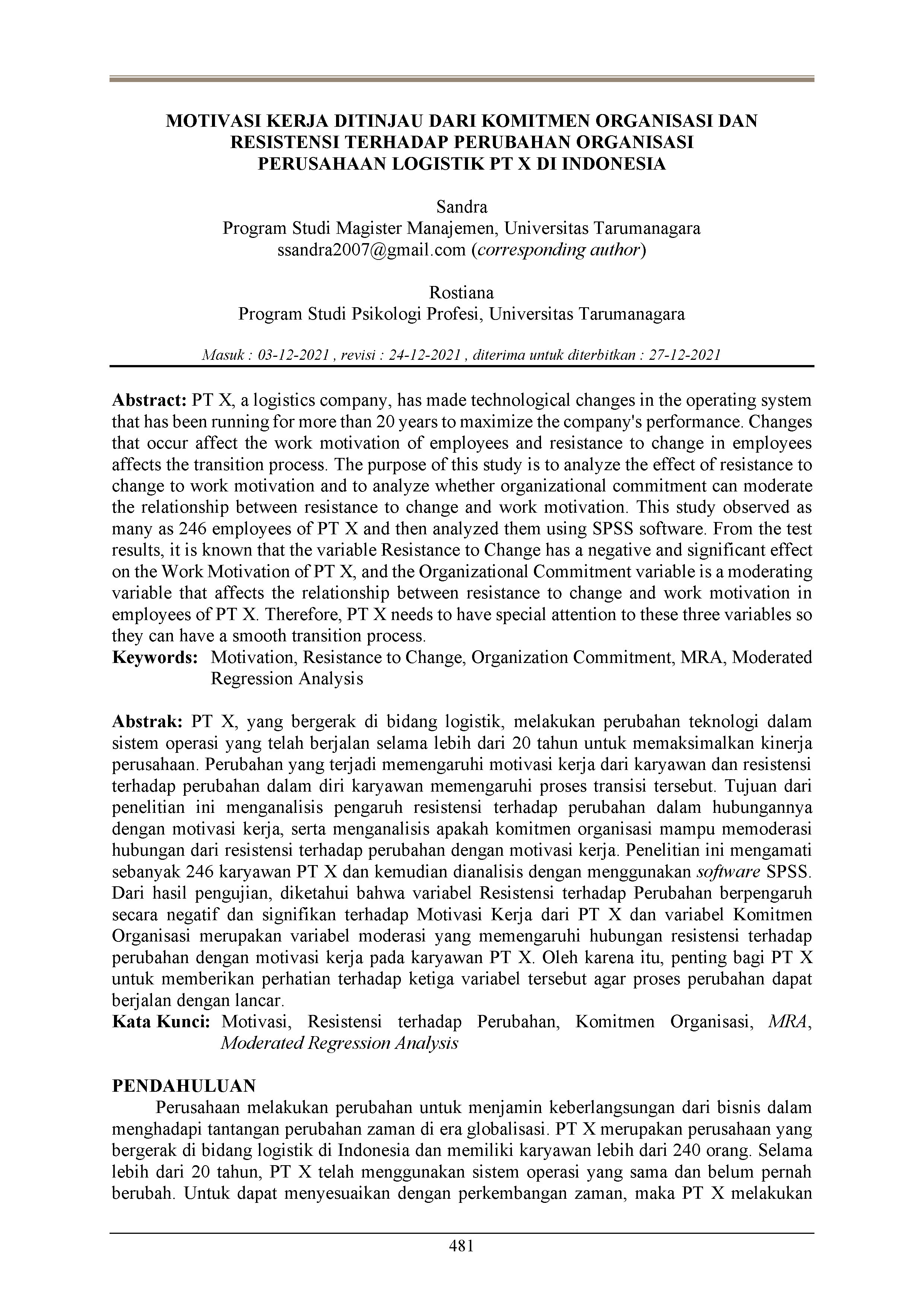 PT X, yang bergerak di bidang logistik, melakukan perubahan teknologi dalam sistem operasi yang telah berjalan selama lebih dari 20 tahun untuk memaksimalkan kinerja perusahaan. Perubahan yang terjadi memengaruhi motivasi kerja dari karyawan dan resistensi terhadap perubahan dalam diri karyawan memengaruhi proses transisi tersebut. Tujuan dari penelitian ini menganalisis pengaruh resistensi terhadap perubahan dalam hubungannya dengan motivasi kerja, serta menganalisis apakah komitmen organisasi mampu memoderasi hubungan dari resistensi terhadap perubahan dengan motivasi kerja. Penelitian ini mengamati sebanyak 246 karyawan PT X dan kemudian dianalisis dengan menggunakan software SPSS. Dari hasil pengujian, diketahui bahwa variabel Resistensi terhadap Perubahan berpengaruh secara negatif dan signifikan terhadap Motivasi Kerja dari PT X dan variabel Komitmen Organisasi merupakan variabel moderasi yang memengaruhi hubungan resistensi terhadap perubahan dengan motivasi kerja pada karyawan PT X. Oleh karena itu, penting bagi PT X untuk memberikan perhatian terhadap ketiga variabel tersebut agar proses perubahan dapat berjalan dengan lancar.