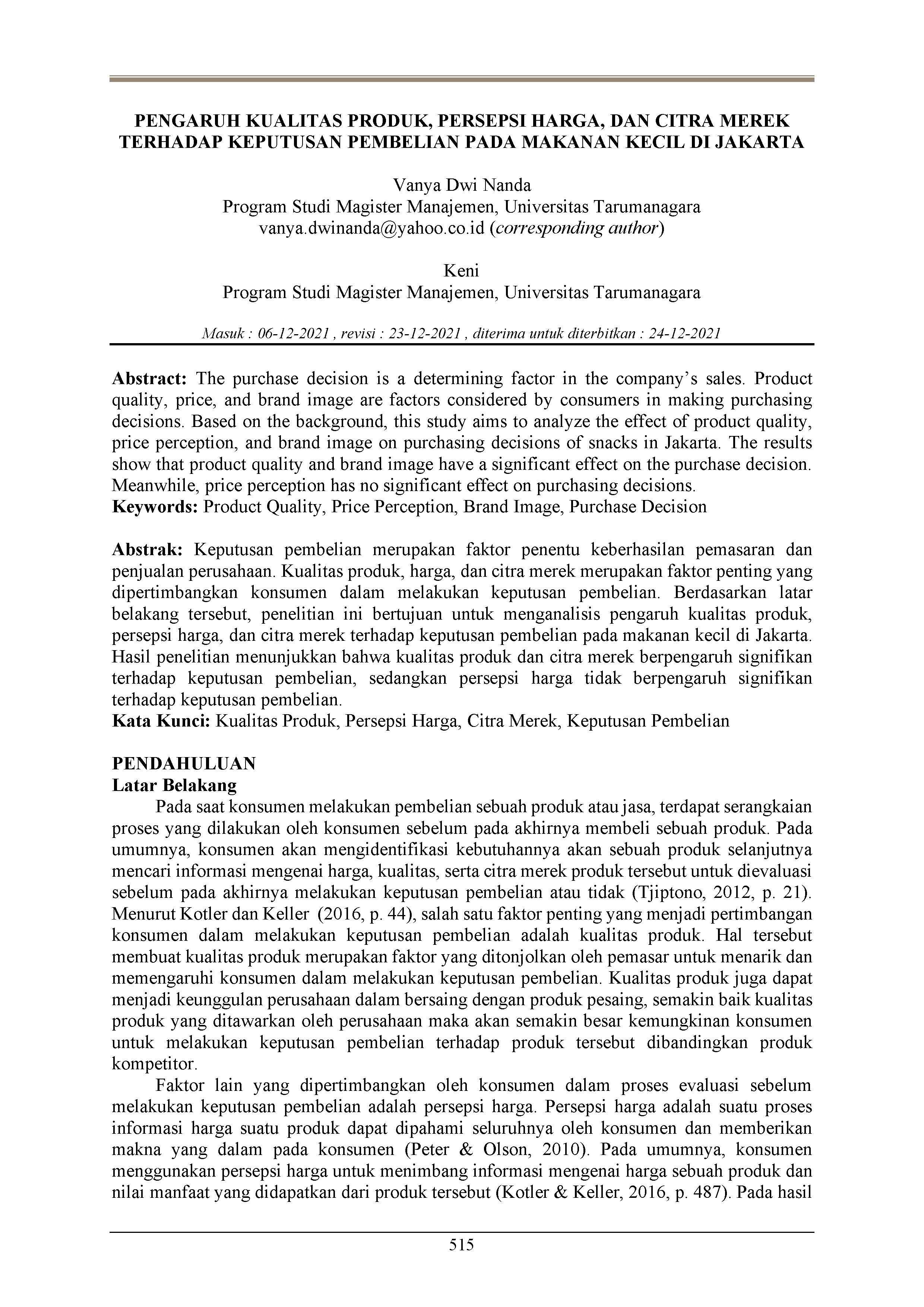Pengaruh Kualitas Produk, Persepsi Harga, dan Citra Merek terhadap Keputusan Pembelian pada Makanan Kecil di Jakarta