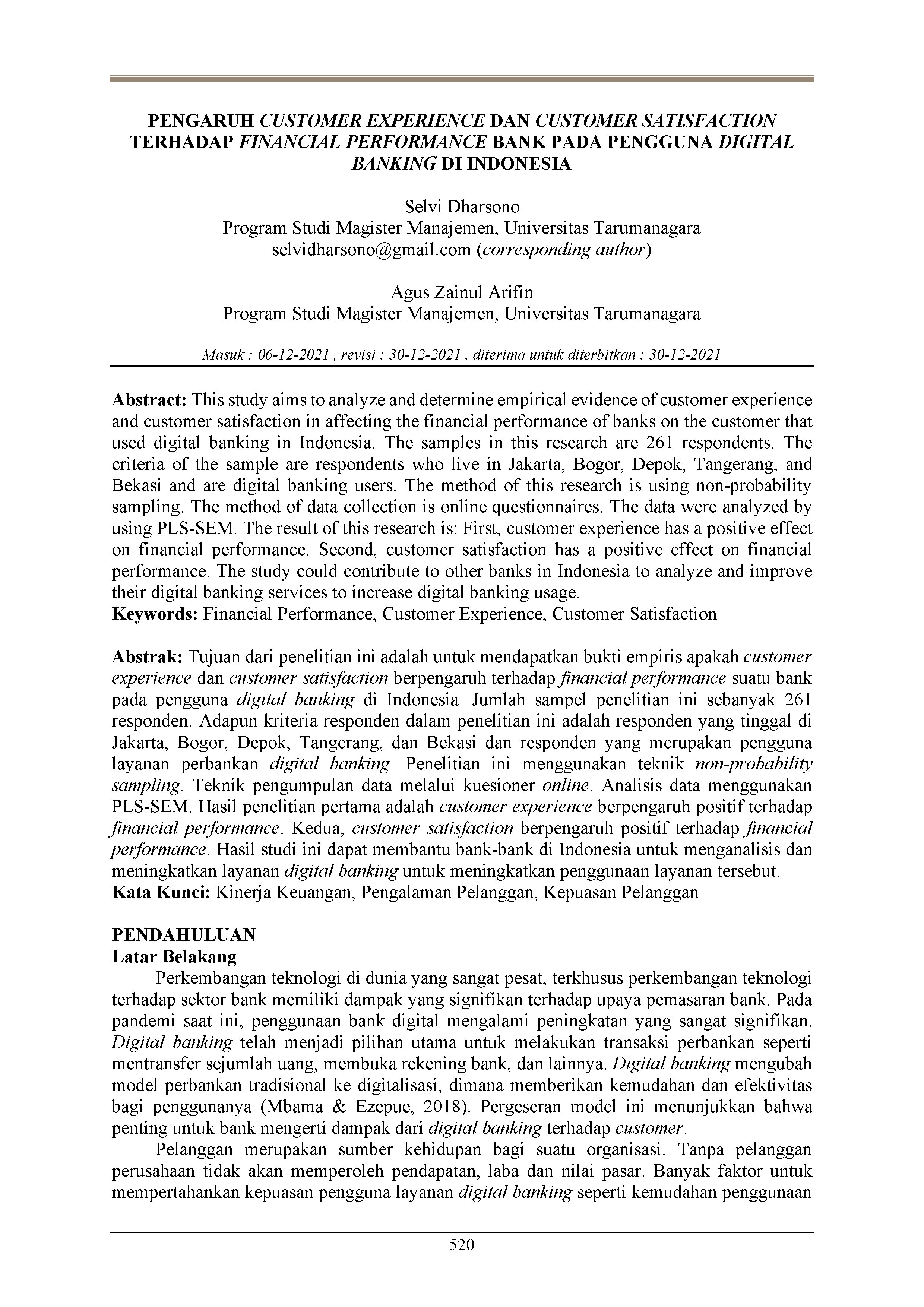 Tujuan dari penelitian ini adalah untuk mendapatkan bukti empiris apakah customer experience dan customer satisfaction berpengaruh terhadap financial performance suatu bank pada pengguna digital banking di Indonesia. Jumlah sampel penelitian ini sebanyak 261 responden. Adapun kriteria responden dalam penelitian ini adalah responden yang tinggal di Jakarta, Bogor, Depok, Tangerang, dan Bekasi dan responden yang merupakan pengguna layanan perbankan digital banking. Penelitian ini menggunakan teknik non-probability sampling. Teknik pengumpulan data melalui kuesioner online. Analisis data menggunakan PLS-SEM. Hasil penelitian pertama adalah customer experience berpengaruh positif terhadap financial performance. Kedua, customer satisfaction berpengaruh positif terhadap financial performance. Hasil studi ini dapat membantu bank-bank di Indonesia untuk menganalisis dan meningkatkan layanan digital banking untuk meningkatkan penggunaan layanan tersebut.