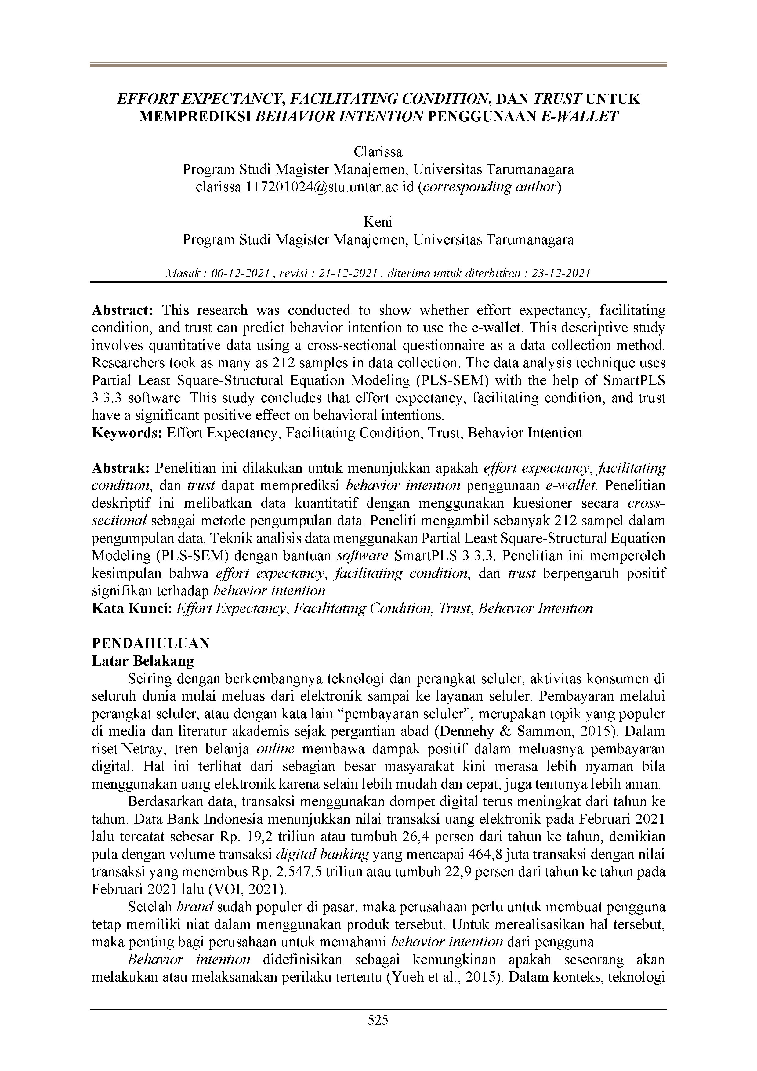 Penelitian ini dilakukan untuk menunjukkan apakah effort expectancy, facilitating condition, dan trust dapat memprediksi behavior intention penggunaan e-wallet. Penelitian deskriptif ini melibatkan data kuantitatif dengan menggunakan kuesioner secara cross-sectional sebagai metode pengumpulan data. Peneliti mengambil sebanyak 212 sampel dalam pengumpulan data. Teknik analisis data menggunakan Partial Least Square-Structural Equation Modeling (PLS-SEM) dengan bantuan software SmartPLS 3.3.3. Penelitian ini memperoleh kesimpulan bahwa effort expectancy, facilitating condition, dan trust berpengaruh positif signifikan terhadap behavior intention.