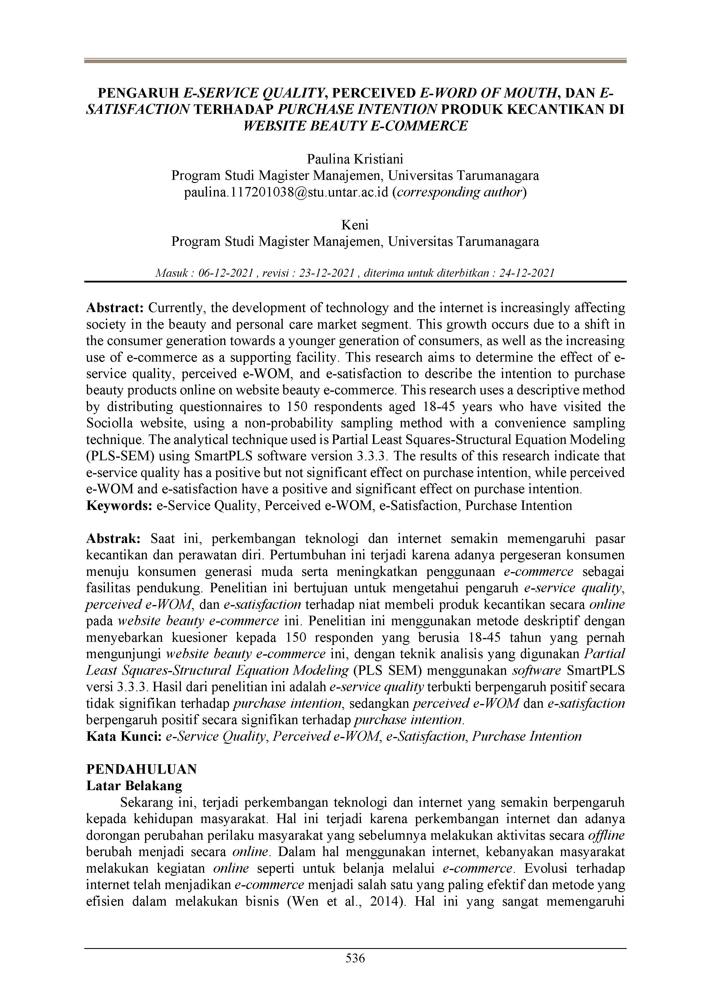 Pengaruh e-Service Quality, Perceived e-Word of Mouth, dan e-Satisfaction terhadap Purchase Intention Produk Kecantikan di Website Beauty e-Commerce