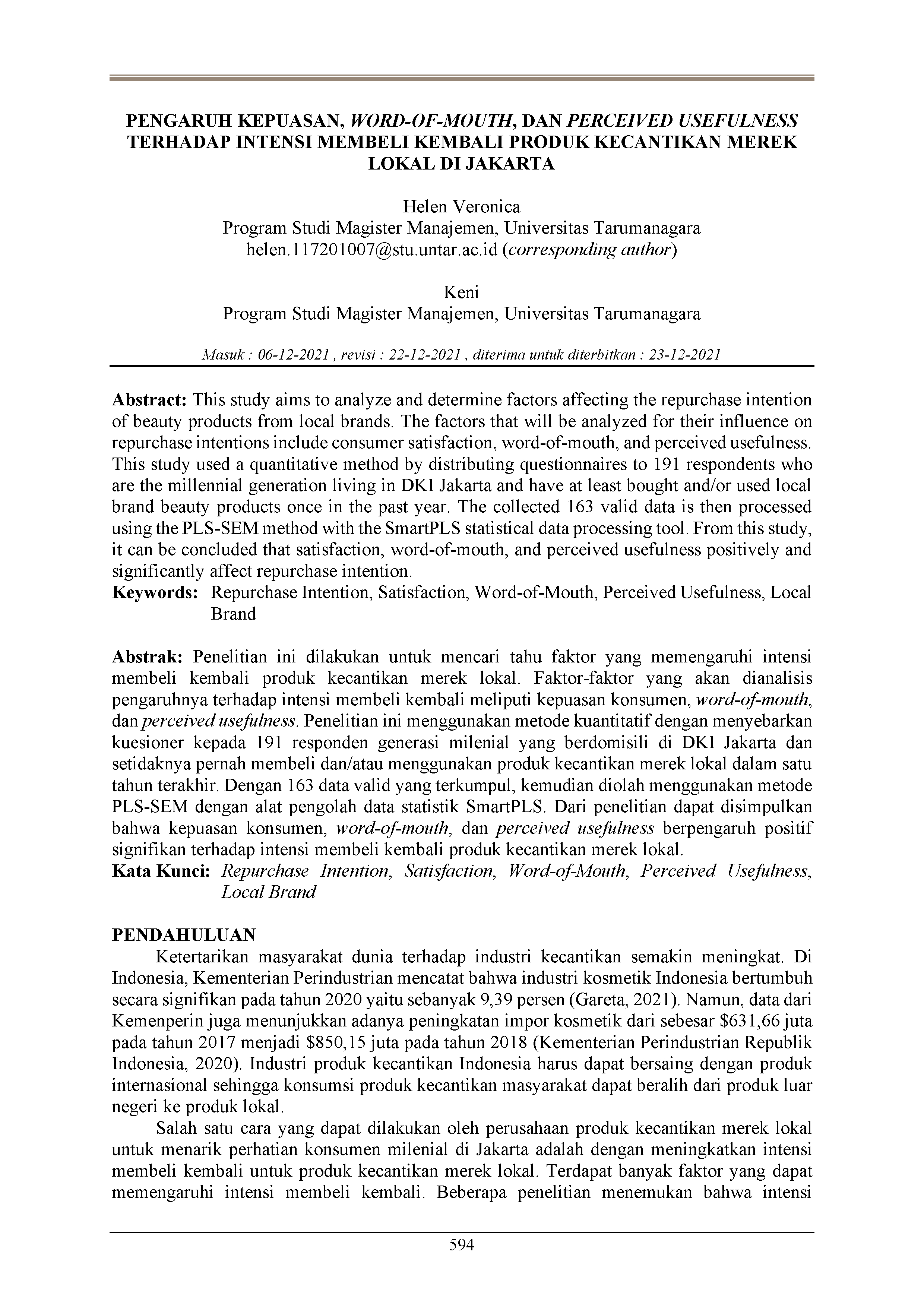 Penelitian ini dilakukan untuk mencari tahu faktor yang memengaruhi intensi membeli kembali produk kecantikan merek lokal. Faktor-faktor yang akan dianalisis pengaruhnya terhadap intensi membeli kembali meliputi kepuasan konsumen, word-of-mouth, dan perceived usefulness. Penelitian ini menggunakan metode kuantitatif dengan menyebarkan kuesioner kepada 191 responden generasi milenial yang berdomisili di DKI Jakarta dan setidaknya pernah membeli dan/atau menggunakan produk kecantikan merek lokal dalam satu tahun terakhir. Dengan 163 data valid yang terkumpul, kemudian diolah menggunakan metode PLS-SEM dengan alat pengolah data statistik SmartPLS. Dari penelitian dapat disimpulkan bahwa kepuasan konsumen, word-of-mouth, dan perceived usefulness berpengaruh positif signifikan terhadap intensi membeli kembali produk kecantikan merek lokal.