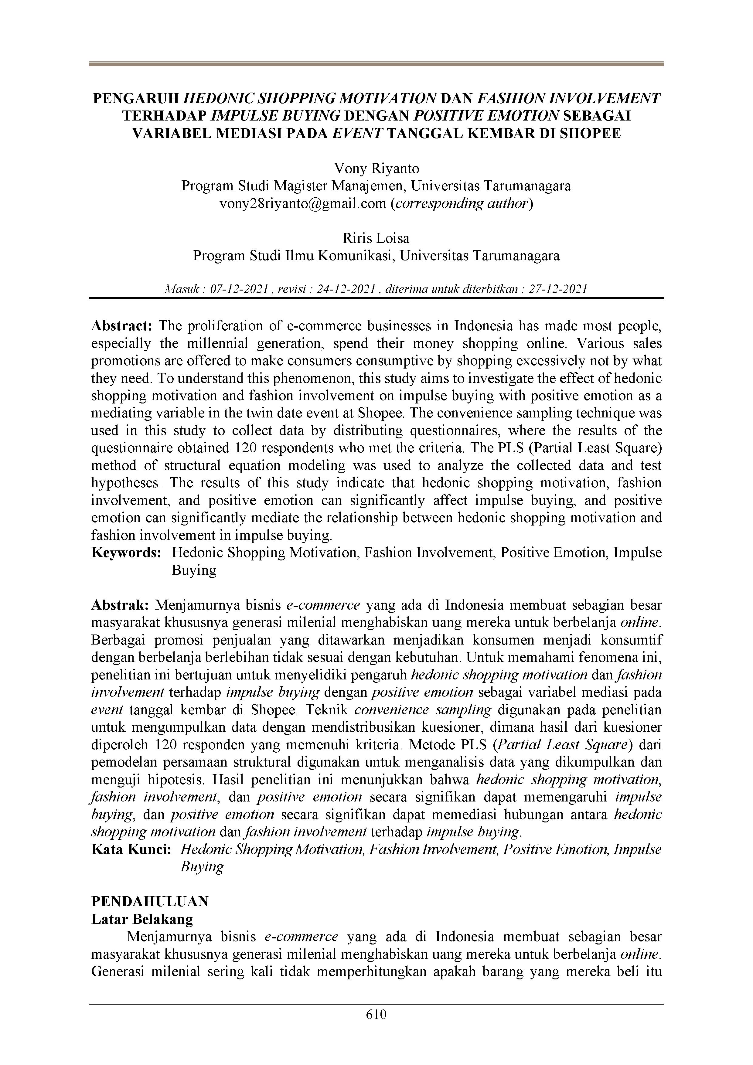 Pengaruh Hedonic Shopping Motivation dan Fashion Involvement terhadap Impulse Buying dengan Positive Emotion sebagai Variabel Mediasi pada Event Tanggal Kembar di Shopee