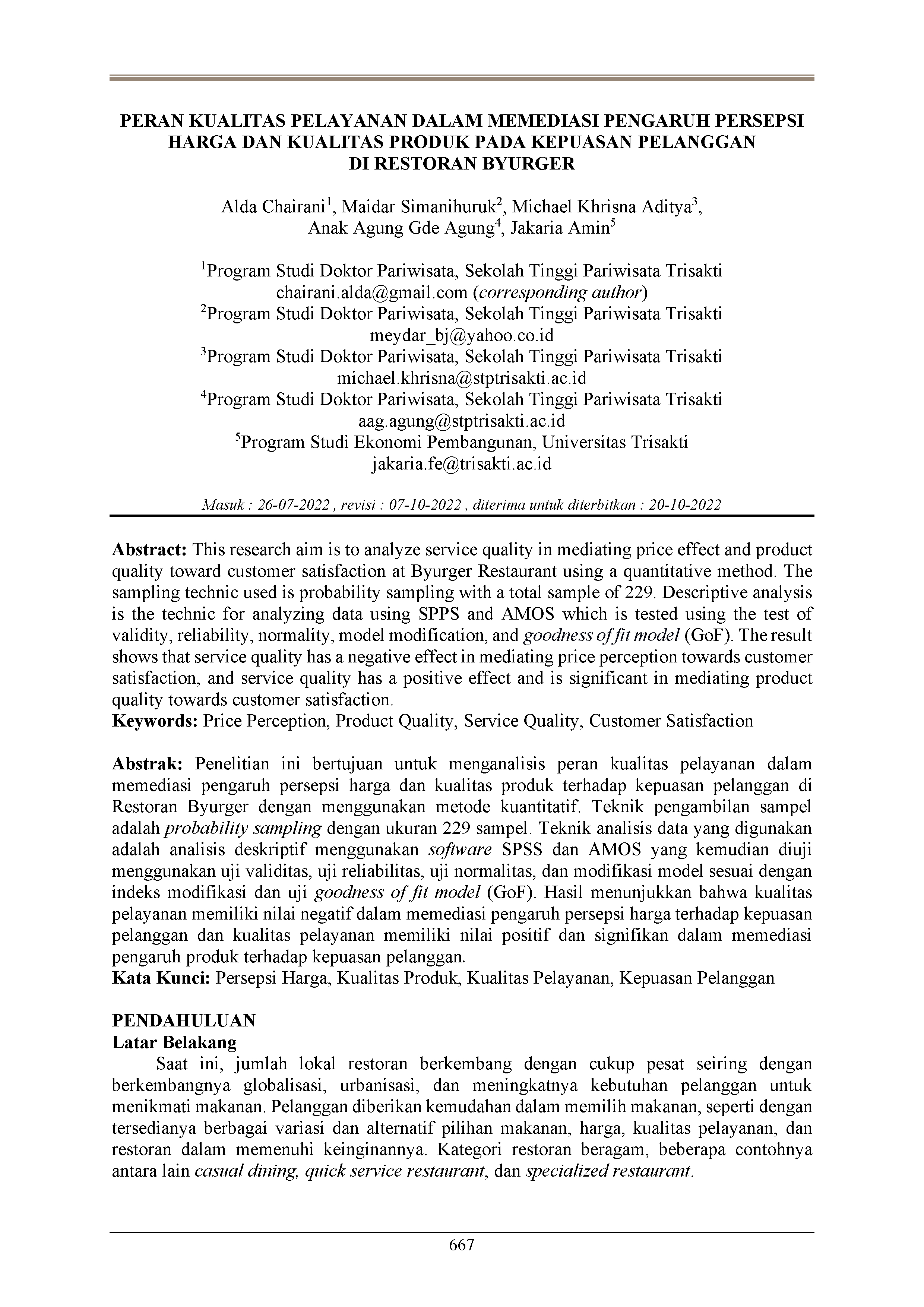 Penelitian ini bertujuan untuk menganalisis peran kualitas pelayanan dalam memediasi pengaruh persepsi harga dan kualitas produk terhadap kepuasan pelanggan di Restoran Byurger dengan menggunakan metode kuantitatif. Teknik pengambilan sampel adalah probability sampling dengan ukuran 229 sampel. Teknik analisis data yang digunakan adalah analisis deskriptif menggunakan software SPSS dan AMOS yang kemudian diuji menggunakan uji validitas, uji reliabilitas, uji normalitas, dan modifikasi model sesuai dengan indeks modifikasi dan uji goodness of fit model (GoF). Hasil menunjukkan bahwa kualitas pelayanan memiliki nilai negatif dalam memediasi pengaruh persepsi harga terhadap kepuasan pelanggan dan kualitas pelayanan memiliki nilai positif dan signifikan dalam memediasi pengaruh produk terhadap kepuasan pelanggan.