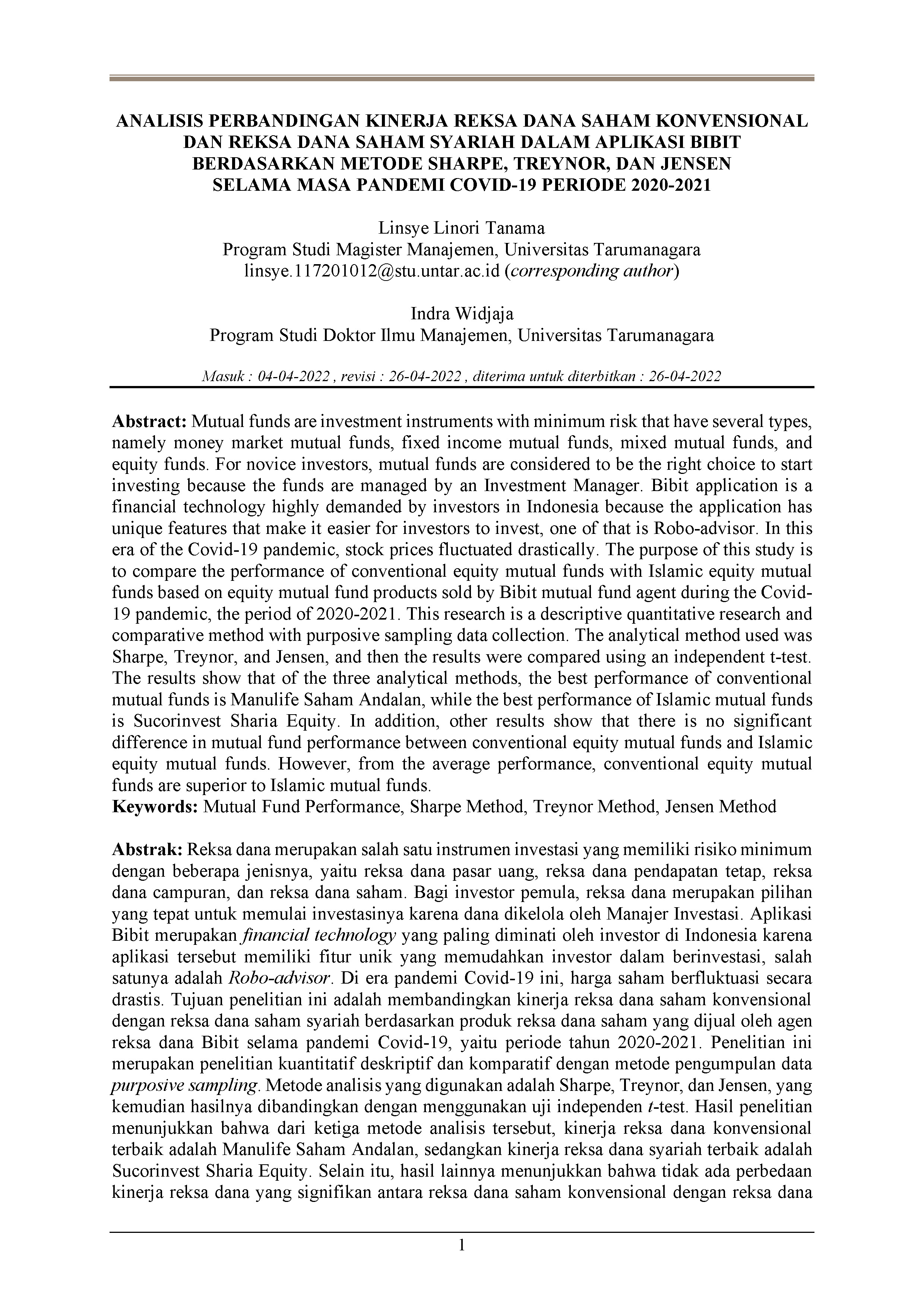 Tanama, L. L., & Widjaja, I. (2023). Analisis perbandingan kinerja reksa dana saham konvensional dan reksa dana saham syariah dalam aplikasi Bibit berdasarkan metode Sharpe, Treynor, dan Jensen selama masa pandemi Covid-19 periode 2020-2021. Jurnal Manajemen Bisnis Dan Kewirausahaan, 7(1), 1–14. https://doi.org/10.24912/jmbk.v7i1.22465