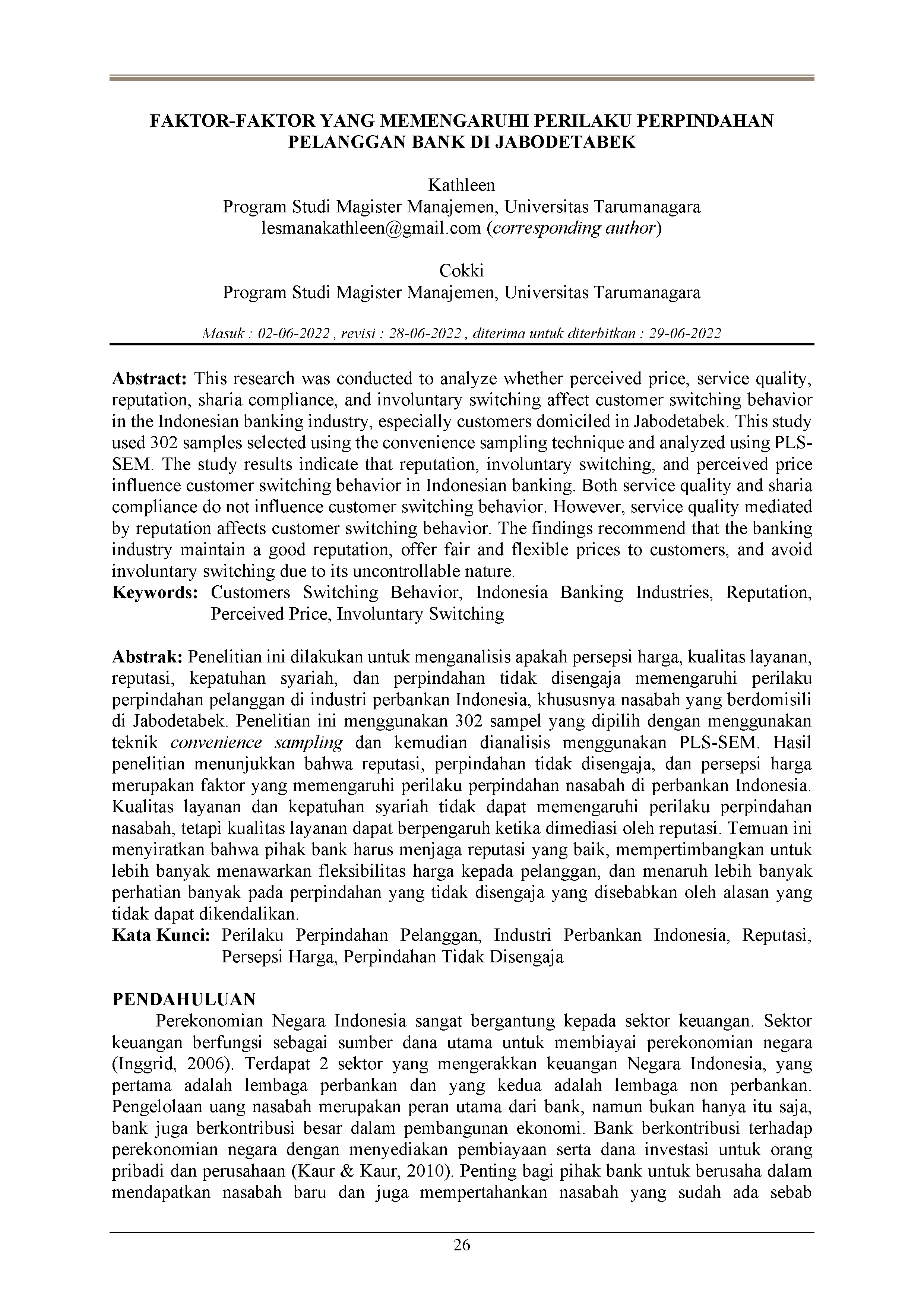 Penelitian ini dilakukan untuk menganalisis apakah persepsi harga, kualitas layanan, reputasi, kepatuhan syariah, dan perpindahan tidak disengaja memengaruhi perilaku perpindahan pelanggan di industri perbankan Indonesia, khususnya nasabah yang berdomisili di Jabodetabek. Penelitian ini menggunakan 302 sampel yang dipilih dengan menggunakan teknik convenience sampling dan kemudian dianalisis menggunakan PLS-SEM. Hasil penelitian menunjukkan bahwa reputasi, perpindahan tidak disengaja, dan persepsi harga merupakan faktor yang memengaruhi perilaku perpindahan nasabah di perbankan Indonesia. Kualitas layanan dan kepatuhan syariah tidak dapat memengaruhi perilaku perpindahan nasabah, tetapi kualitas layanan dapat berpengaruh ketika dimediasi oleh reputasi. Temuan ini menyiratkan bahwa pihak bank harus menjaga reputasi yang baik, mempertimbangkan untuk lebih banyak menawarkan fleksibilitas harga kepada pelanggan, dan menaruh lebih banyak perhatian banyak pada perpindahan yang tidak disengaja yang disebabkan oleh alasan yang tidak dapat dikendalikan.