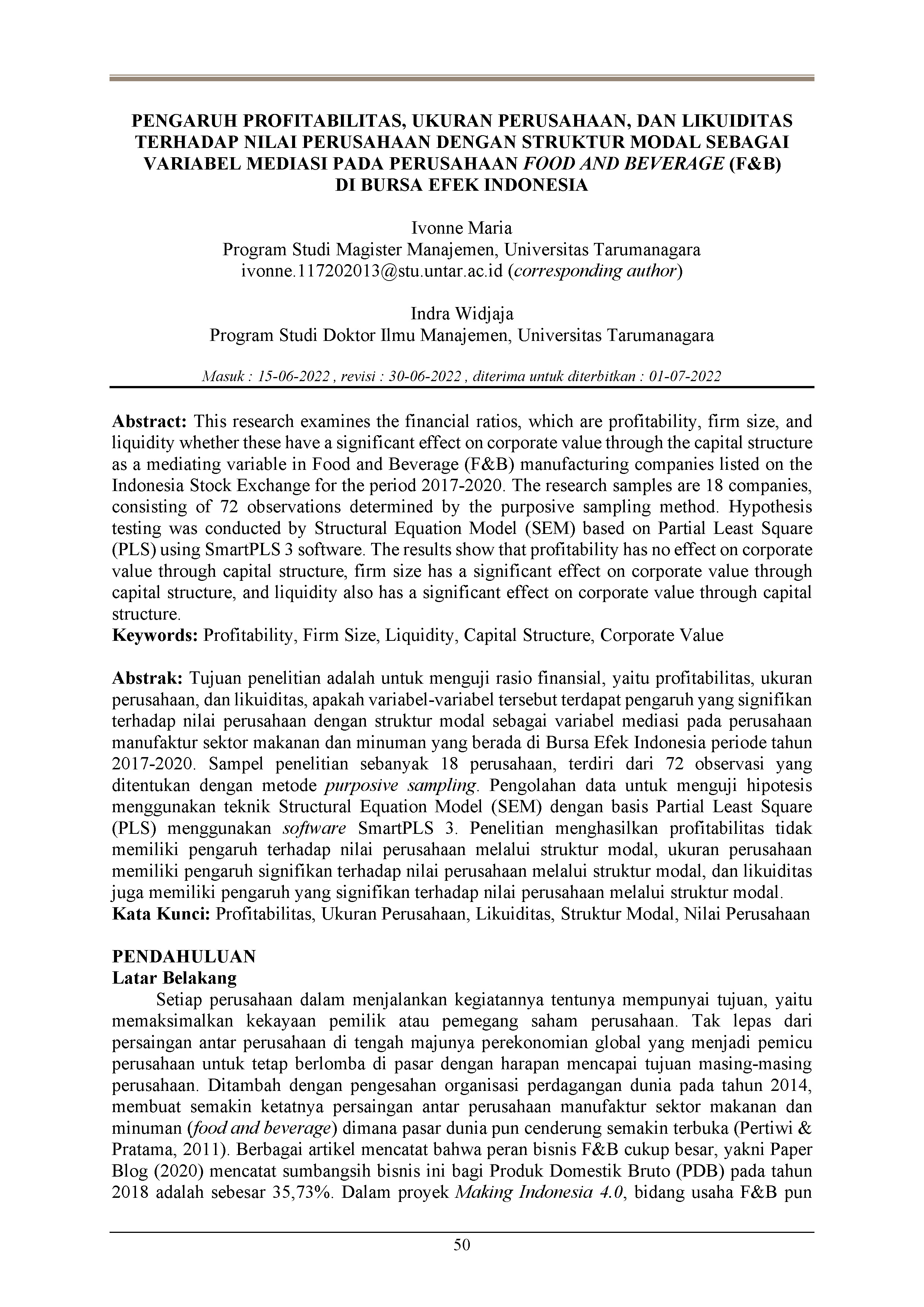 Pengaruh profitabilitas, ukuran perusahaan, dan likuiditas terhadap nilai perusahaan dengan struktur modal sebagai variabel mediasi pada perusahaan food and beverage (F&B) di Bursa Efek Indonesia