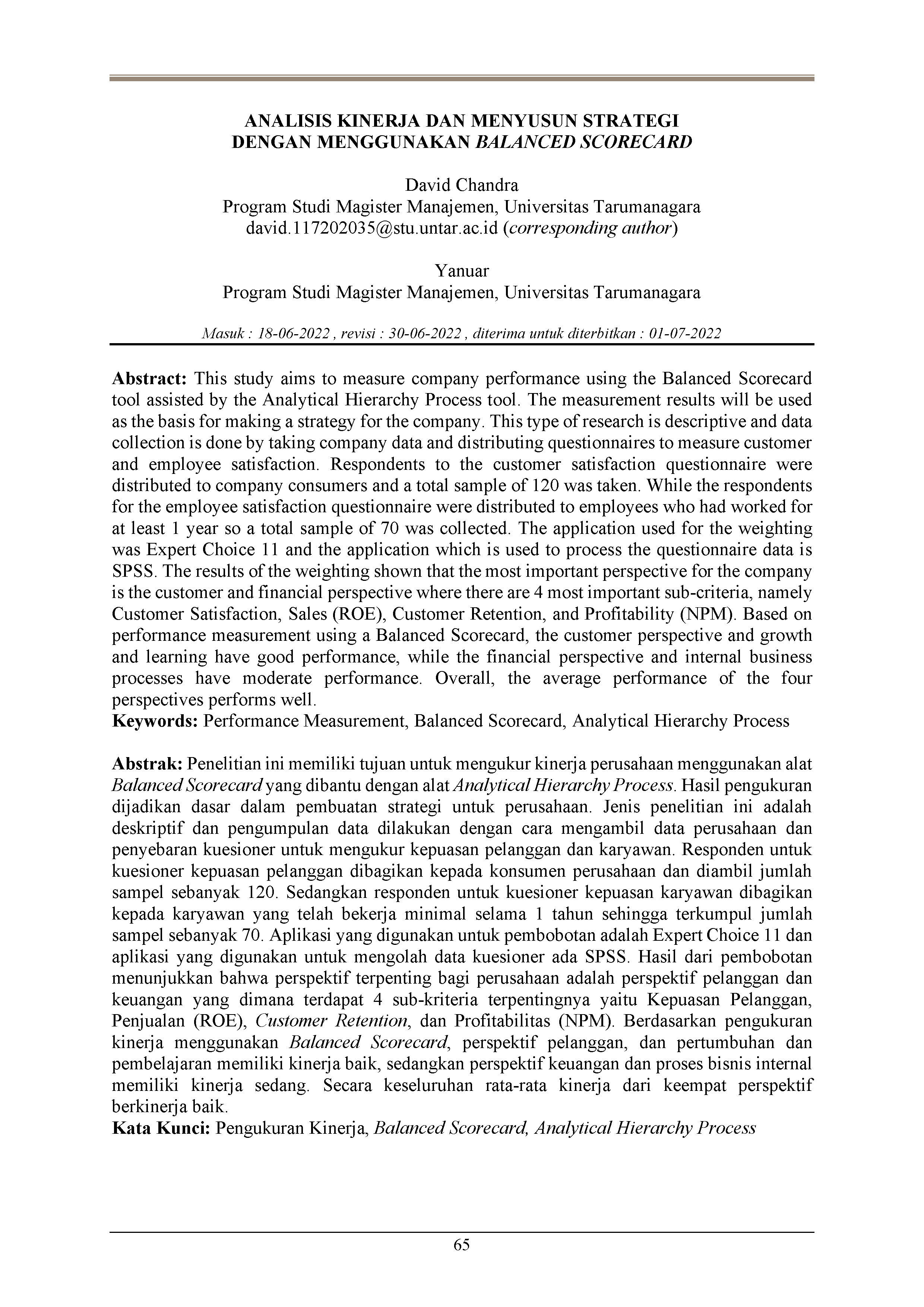 Penelitian ini memiliki tujuan untuk mengukur kinerja perusahaan menggunakan alat Balanced Scorecard yang dibantu dengan alat Analytical Hierarchy Process. Hasil pengukuran dijadikan dasar dalam pembuatan strategi untuk perusahaan. Jenis penelitian ini adalah deskriptif dan pengumpulan data dilakukan dengan cara mengambil data perusahaan dan penyebaran kuesioner untuk mengukur kepuasan pelanggan dan karyawan. Responden untuk kuesioner kepuasan pelanggan dibagikan kepada konsumen perusahaan dan diambil jumlah sampel sebanyak 120. Sedangkan responden untuk kuesioner kepuasan karyawan dibagikan kepada karyawan yang telah bekerja minimal selama 1 tahun sehingga terkumpul jumlah sampel sebanyak 70. Aplikasi yang digunakan untuk pembobotan adalah Expert Choice 11 dan aplikasi yang digunakan untuk mengolah data kuesioner ada SPSS. Hasil dari pembobotan menunjukkan bahwa perspektif terpenting bagi perusahaan adalah perspektif pelanggan dan keuangan yang dimana terdapat 4 sub-kriteria terpentingnya yaitu Kepuasan Pelanggan, Penjualan (ROE), Customer Retention, dan Profitabilitas (NPM). Berdasarkan pengukuran kinerja menggunakan Balanced Scorecard, perspektif pelanggan, dan pertumbuhan dan pembelajaran memiliki kinerja baik, sedangkan perspektif keuangan dan proses bisnis internal memiliki kinerja sedang. Secara keseluruhan rata-rata kinerja dari keempat perspektif berkinerja baik.