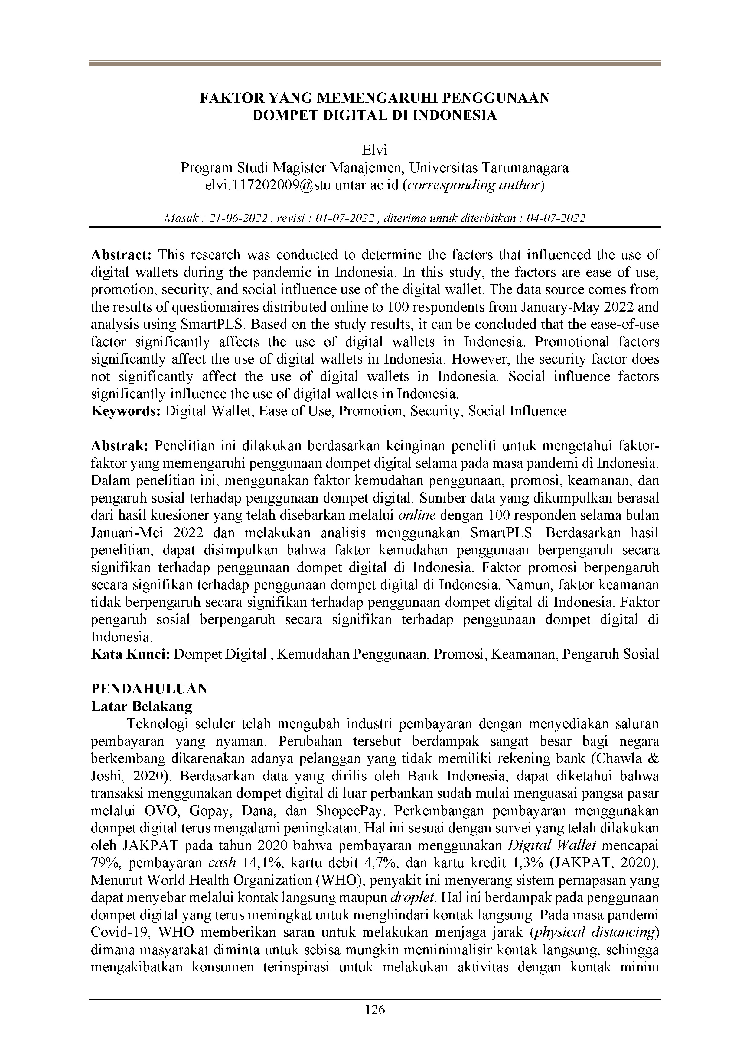 Penelitian ini dilakukan berdasarkan keinginan peneliti untuk mengetahui faktor-faktor yang memengaruhi penggunaan dompet digital selama pada masa pandemi di Indonesia. Dalam penelitian ini, menggunakan faktor kemudahan penggunaan, promosi, keamanan, dan pengaruh sosial terhadap penggunaan dompet digital. Sumber data yang dikumpulkan berasal dari hasil kuesioner yang telah disebarkan melalui online dengan 100 responden selama bulan Januari-Mei 2022 dan melakukan analisis menggunakan SmartPLS. Berdasarkan hasil penelitian, dapat disimpulkan bahwa faktor kemudahan penggunaan berpengaruh secara signifikan terhadap penggunaan dompet digital di Indonesia. Faktor promosi berpengaruh secara signifikan terhadap penggunaan dompet digital di Indonesia. Namun, faktor keamanan tidak berpengaruh secara signifikan terhadap penggunaan dompet digital di Indonesia. Faktor pengaruh sosial berpengaruh secara signifikan terhadap penggunaan dompet digital di Indonesia.