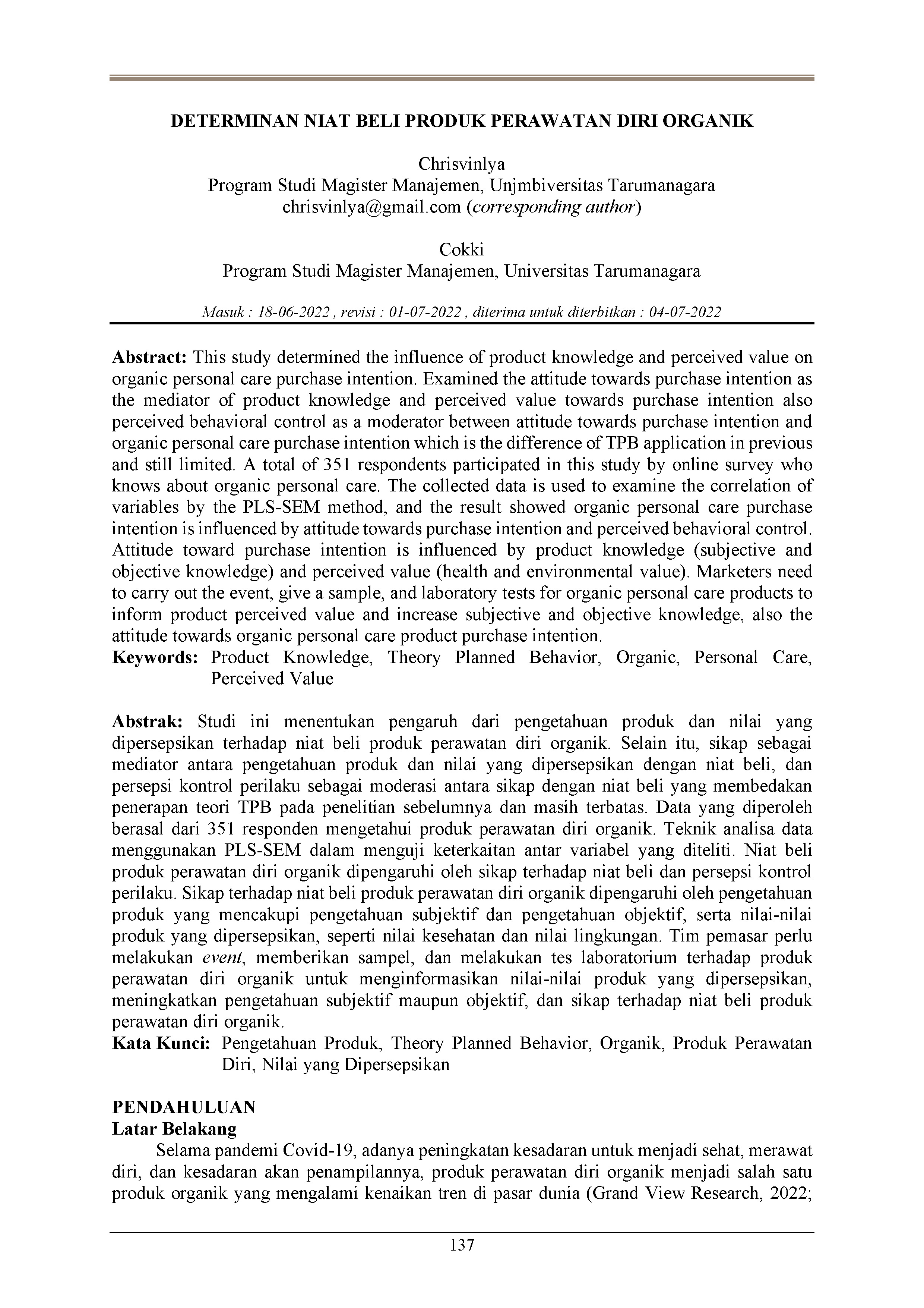 Studi ini menentukan pengaruh dari pengetahuan produk dan nilai yang dipersepsikan terhadap niat beli produk perawatan diri organik. Selain itu, sikap sebagai mediator antara pengetahuan produk dan nilai yang dipersepsikan dengan niat beli, dan persepsi kontrol perilaku sebagai moderasi antara sikap dengan niat beli yang membedakan penerapan teori TPB pada penelitian sebelumnya dan masih terbatas. Data yang diperoleh berasal dari 351 responden mengetahui produk perawatan diri organik. Teknik analisa data menggunakan PLS-SEM dalam menguji keterkaitan antar variabel yang diteliti. Niat beli produk perawatan diri organik dipengaruhi oleh sikap terhadap niat beli dan persepsi kontrol perilaku. Sikap terhadap niat beli produk perawatan diri organik dipengaruhi oleh pengetahuan produk yang mencakupi pengetahuan subjektif dan pengetahuan objektif, serta nilai-nilai produk yang dipersepsikan, seperti nilai kesehatan dan nilai lingkungan. Tim pemasar perlu melakukan event, memberikan sampel, dan melakukan tes laboratorium terhadap produk perawatan diri organik untuk menginformasikan nilai-nilai produk yang dipersepsikan, meningkatkan pengetahuan subjektif maupun objektif, dan sikap terhadap niat beli produk perawatan diri organik.