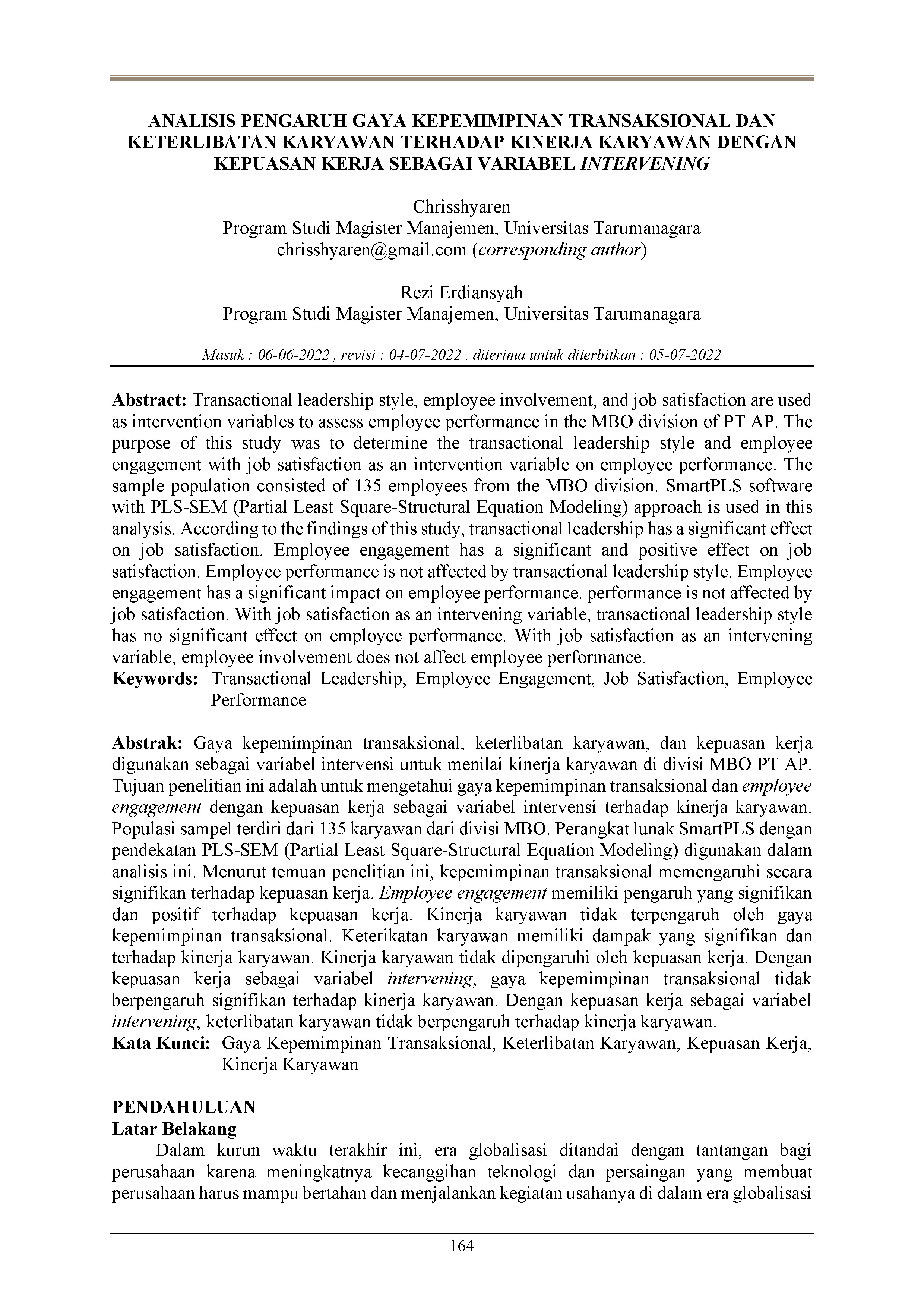 Analisis pengaruh gaya kepemimpinan transaksional dan keterlibatan karyawan terhadap kinerja karyawan dengan kepuasan kerja sebagai variabel intervening