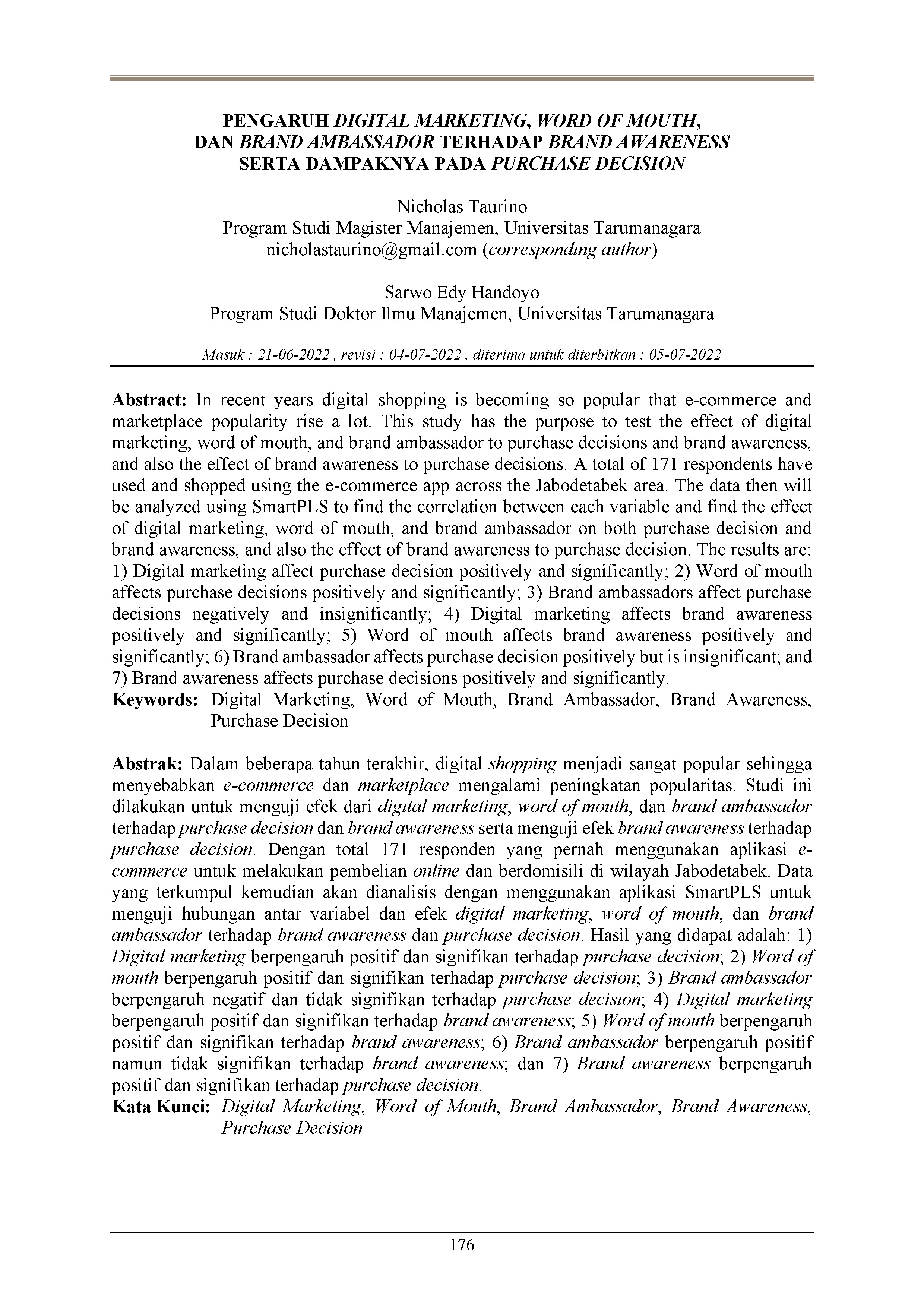 Dalam beberapa tahun terakhir, digital shopping menjadi sangat popular sehingga menyebabkan e-commerce dan marketplace mengalami peningkatan popularitas. Studi ini dilakukan untuk menguji efek dari digital marketing, word of mouth, dan brand ambassador terhadap purchase decision dan brand awareness serta menguji efek brand awareness terhadap purchase decision. Dengan total 171 responden yang pernah menggunakan aplikasi e-commerce untuk melakukan pembelian online dan berdomisili di wilayah Jabodetabek. Data yang terkumpul kemudian akan dianalisis dengan menggunakan aplikasi SmartPLS untuk menguji hubungan antar variabel dan efek digital marketing, word of mouth, dan brand ambassador terhadap brand awareness dan purchase decision. Hasil yang didapat adalah: 1) Digital marketing berpengaruh positif dan signifikan terhadap purchase decision; 2) Word of mouth berpengaruh positif dan signifikan terhadap purchase decision; 3) Brand ambassador berpengaruh negatif dan tidak signifikan terhadap purchase decision; 4) Digital marketing berpengaruh positif dan signifikan terhadap brand awareness; 5) Word of mouth berpengaruh positif dan signifikan terhadap brand awareness; 6) Brand ambassador berpengaruh positif namun tidak signifikan terhadap brand awareness; dan 7) Brand awareness berpengaruh positif dan signifikan terhadap purchase decision.