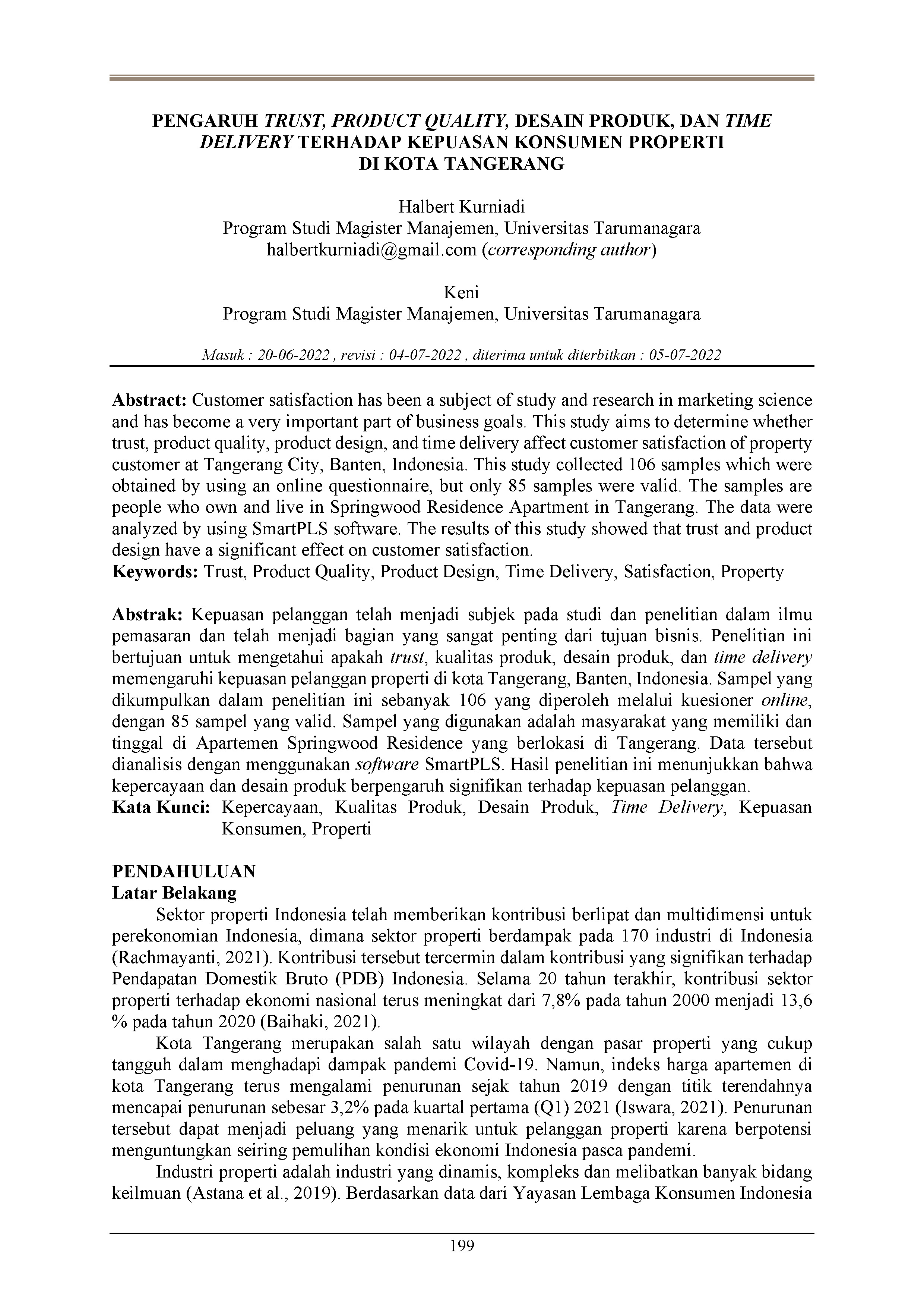 Kepuasan pelanggan telah menjadi subjek pada studi dan penelitian dalam ilmu pemasaran dan telah menjadi bagian yang sangat penting dari tujuan bisnis. Penelitian ini bertujuan untuk mengetahui apakah trust, kualitas produk, desain produk, dan time delivery memengaruhi kepuasan pelanggan properti di kota Tangerang, Banten, Indonesia. Sampel yang dikumpulkan dalam penelitian ini sebanyak 106 yang diperoleh melalui kuesioner online, dengan 85 sampel yang valid. Sampel yang digunakan adalah masyarakat yang memiliki dan tinggal di Apartemen Springwood Residence yang berlokasi di Tangerang. Data tersebut dianalisis dengan menggunakan software SmartPLS. Hasil penelitian ini menunjukkan bahwa kepercayaan dan desain produk berpengaruh signifikan terhadap kepuasan pelanggan.