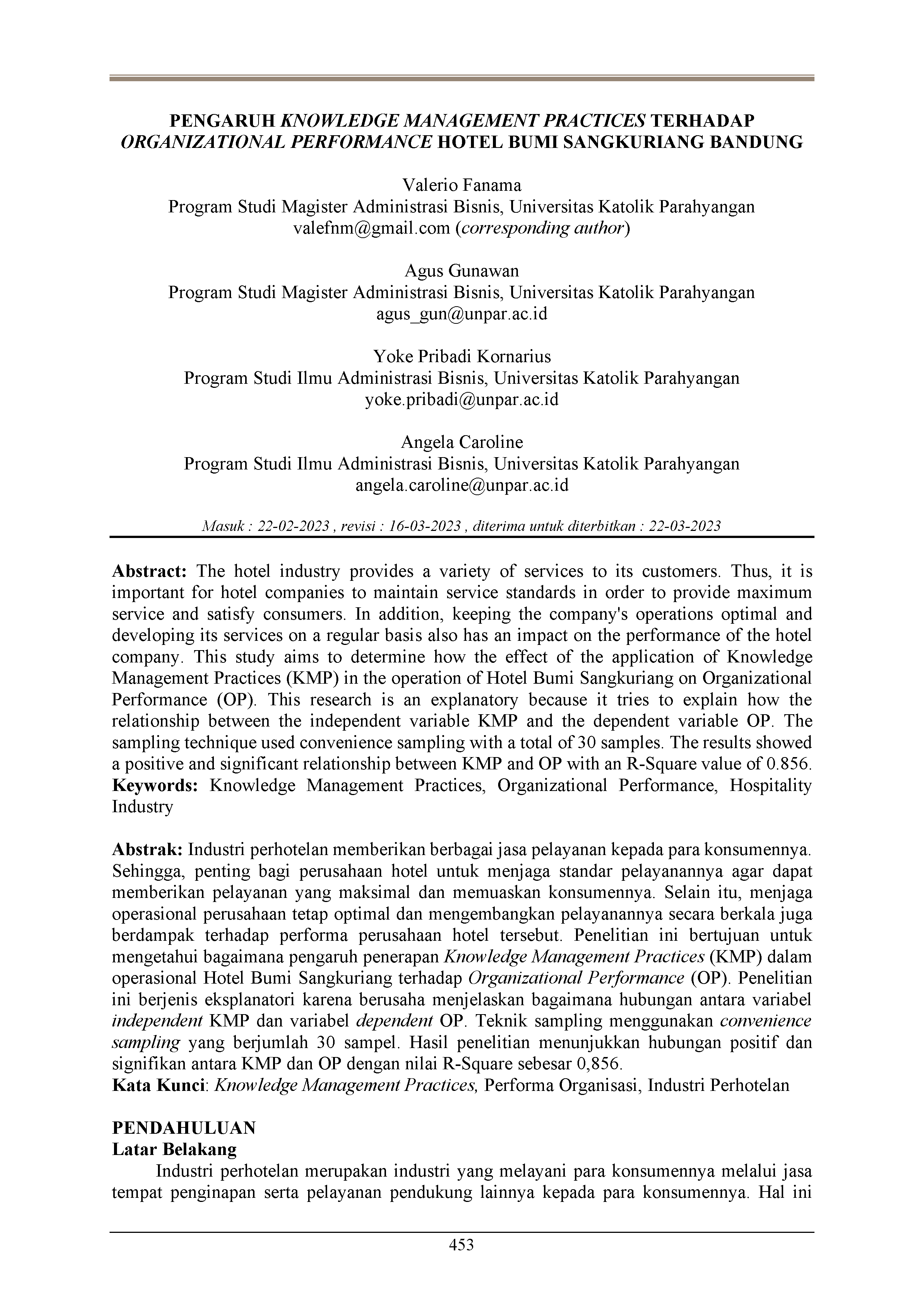 Industri perhotelan memberikan berbagai jasa pelayanan kepada para konsumennya. Sehingga, penting bagi perusahaan hotel untuk menjaga standar pelayanannya agar dapat memberikan pelayanan yang maksimal dan memuaskan konsumennya. Selain itu, menjaga operasional perusahaan tetap optimal dan mengembangkan pelayanannya secara berkala juga berdampak terhadap performa perusahaan hotel tersebut. Penelitian ini bertujuan untuk mengetahui bagaimana pengaruh penerapan Knowledge Management Practices (KMP) dalam operasional Hotel Bumi Sangkuriang terhadap Organizational Performance (OP). Penelitian ini berjenis eksplanatori karena berusaha menjelaskan bagaimana hubungan antara variabel independent KMP dan variabel dependent OP. Teknik sampling menggunakan convenience sampling yang berjumlah 30 sampel. Hasil penelitian menunjukkan hubungan positif dan signifikan antara KMP dan OP dengan nilai R-Square sebesar 0,856.