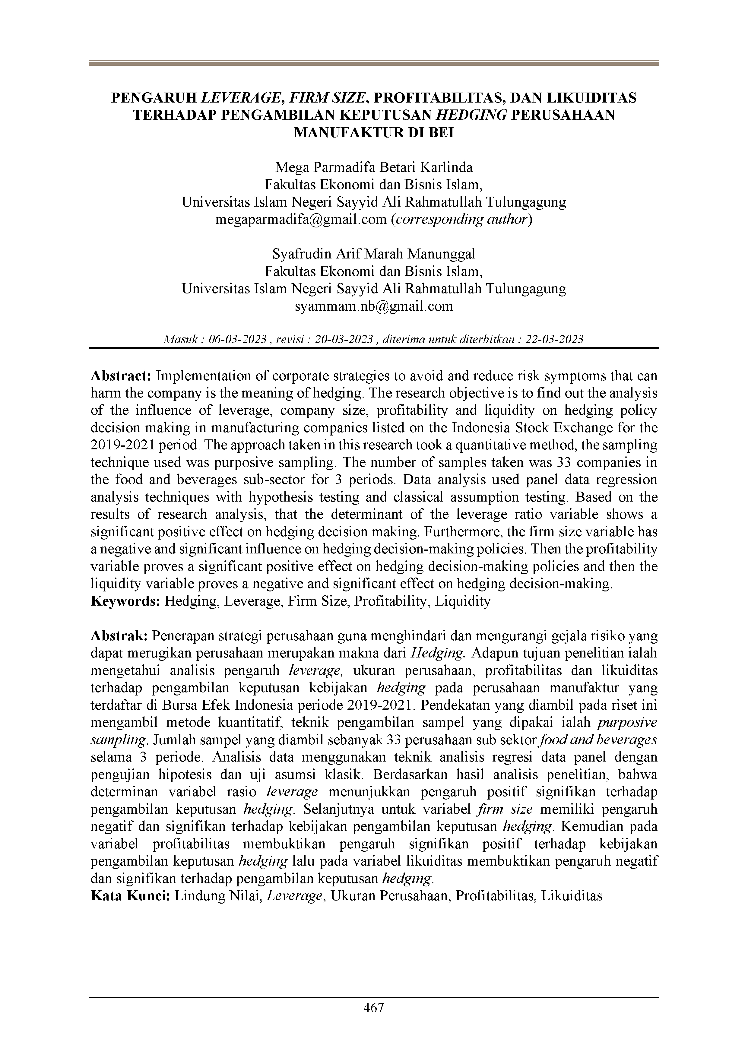 Pengaruh leverage, firm size, profitabilitas, dan likuiditas terhadap pengambilan keputusan hedging perusahaan manufaktur di BEI
