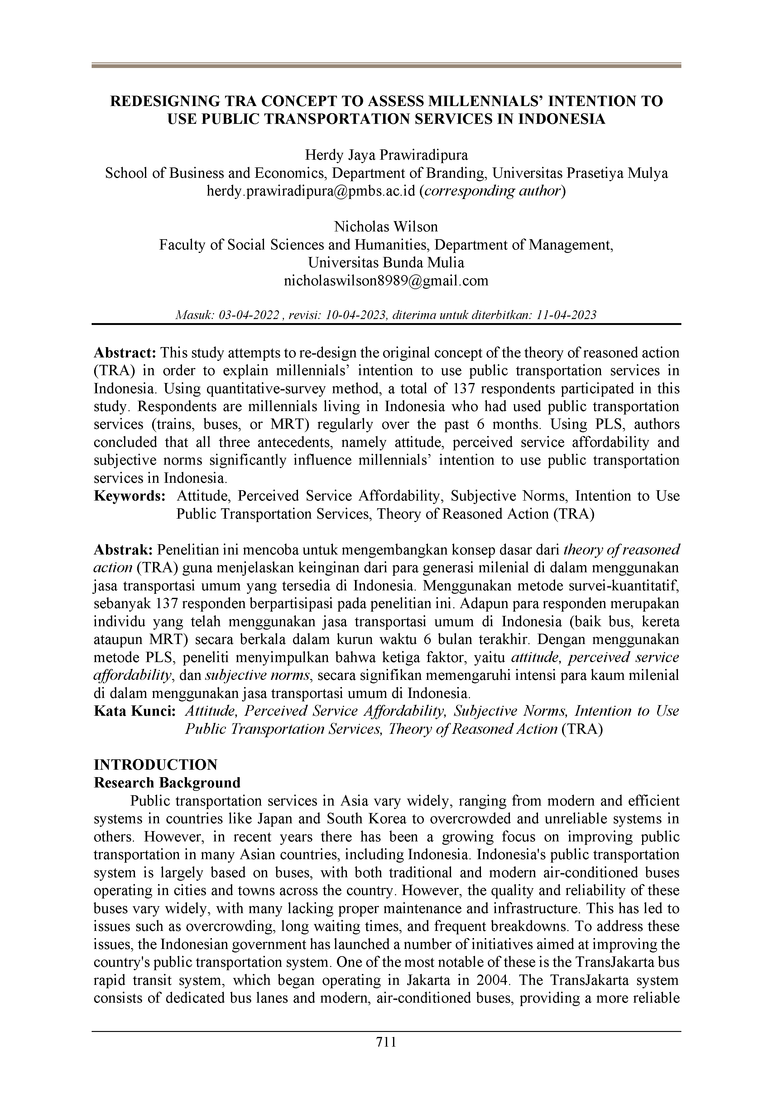 Penelitian ini mencoba untuk mengembangkan konsep dasar dari theory of reasoned action (TRA) guna menjelaskan keinginan dari para generasi milenial di dalam menggunakan jasa transportasi umum yang tersedia di Indonesia. Menggunakan metode survei-kuantitatif, sebanyak 137 responden berpartisipasi pada penelitian ini. Adapun para responden merupakan individu yang telah menggunakan jasa transportasi umum di Indonesia (baik bus, kereta ataupun MRT) secara berkala dalam kurun waktu 6 bulan terakhir. Dengan menggunakan metode PLS, peneliti menyimpulkan bahwa ketiga faktor, yaitu attitude, perceived service affordability, dan subjective norms, secara signifikan memengaruhi intensi para kaum milenial di dalam menggunakan jasa transportasi umum di Indonesia.