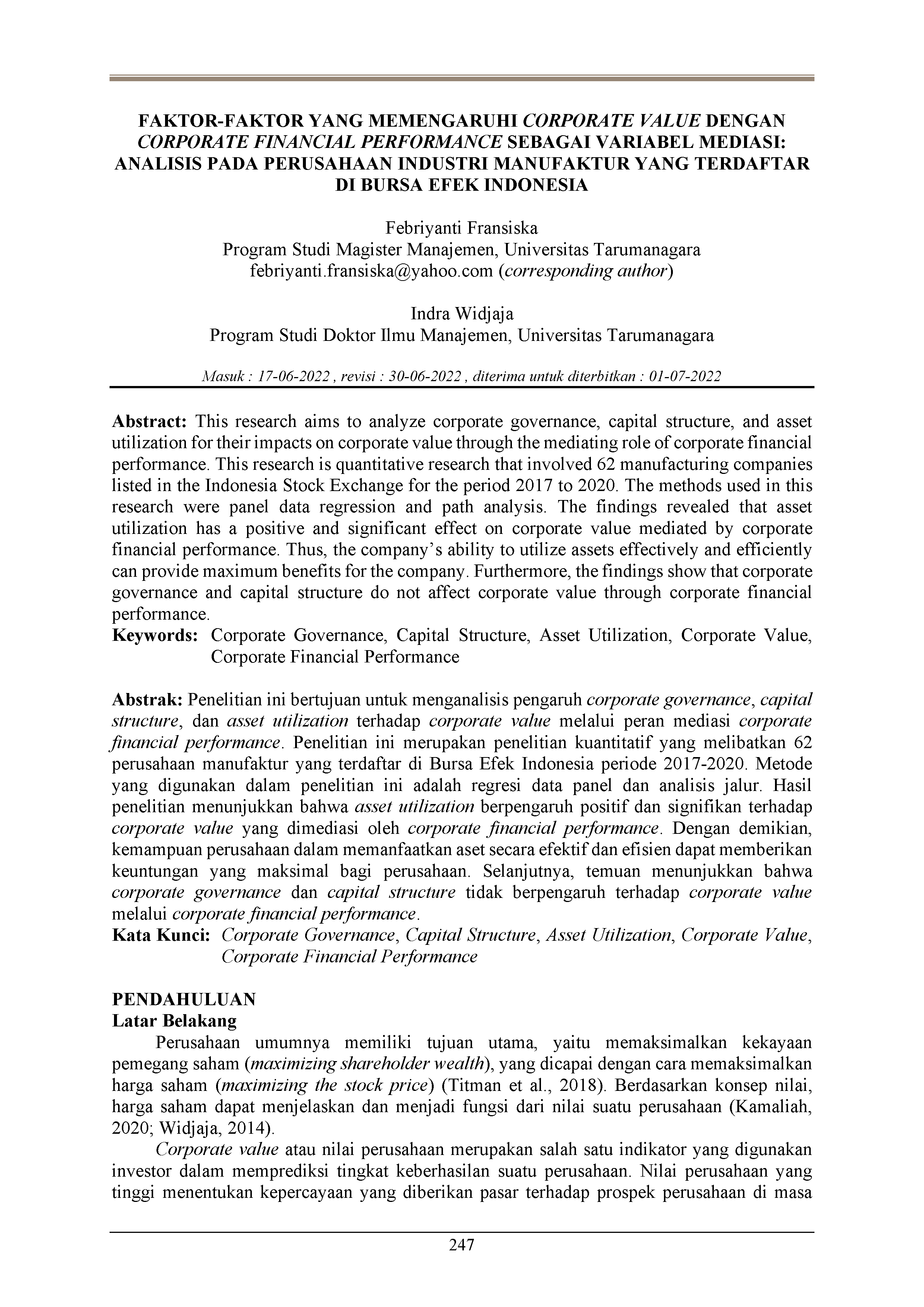 Faktor-faktor yang memengaruhi corporate value dengan corporate financial performance sebagai variabel mediasi: Analisis pada perusahaan industri manufaktur yang terdaftar di Bursa Efek Indonesia