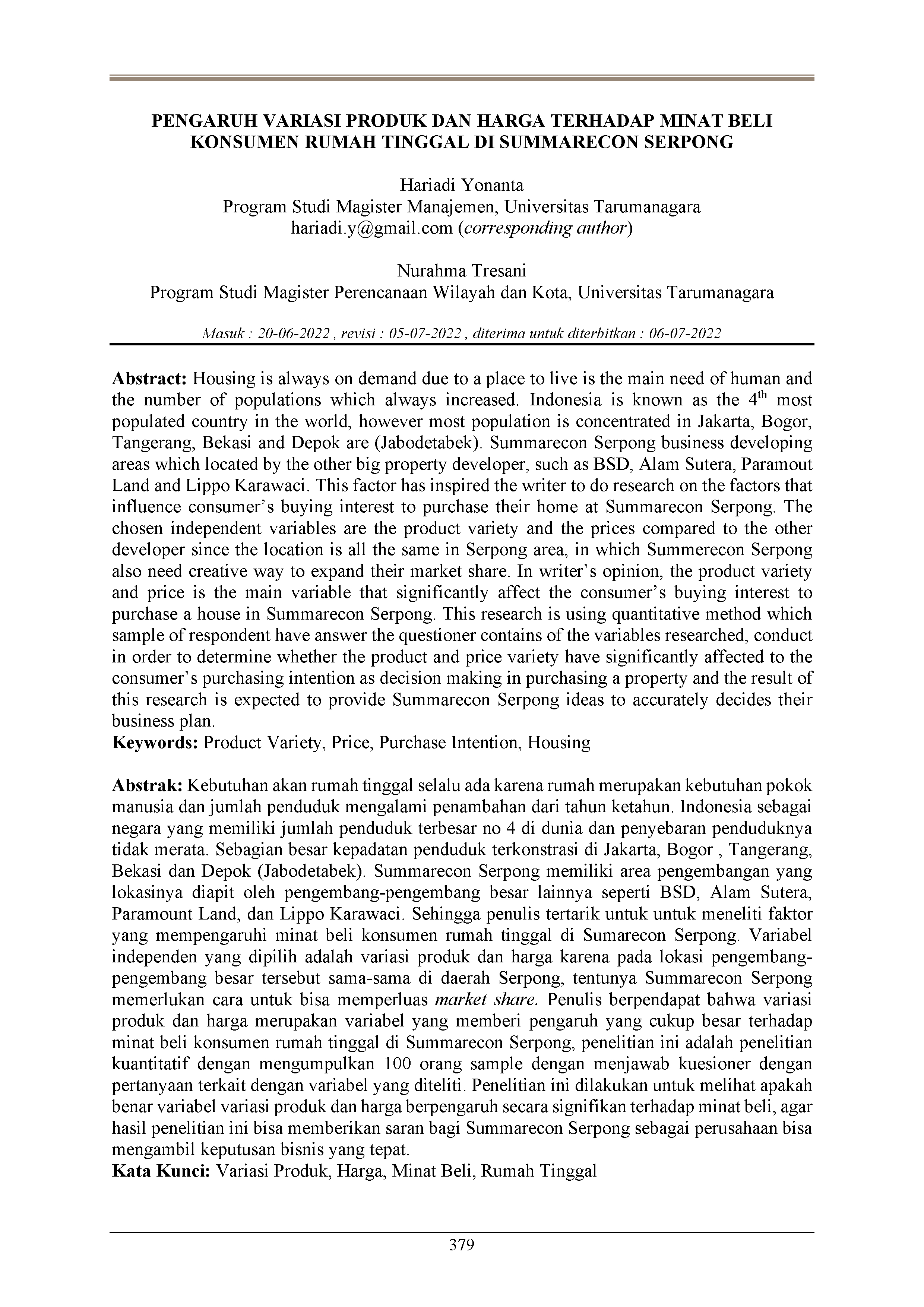 Pengaruh variasi produk dan harga terhadap minat beli konsumen rumah tinggal di Summarecon Serpong