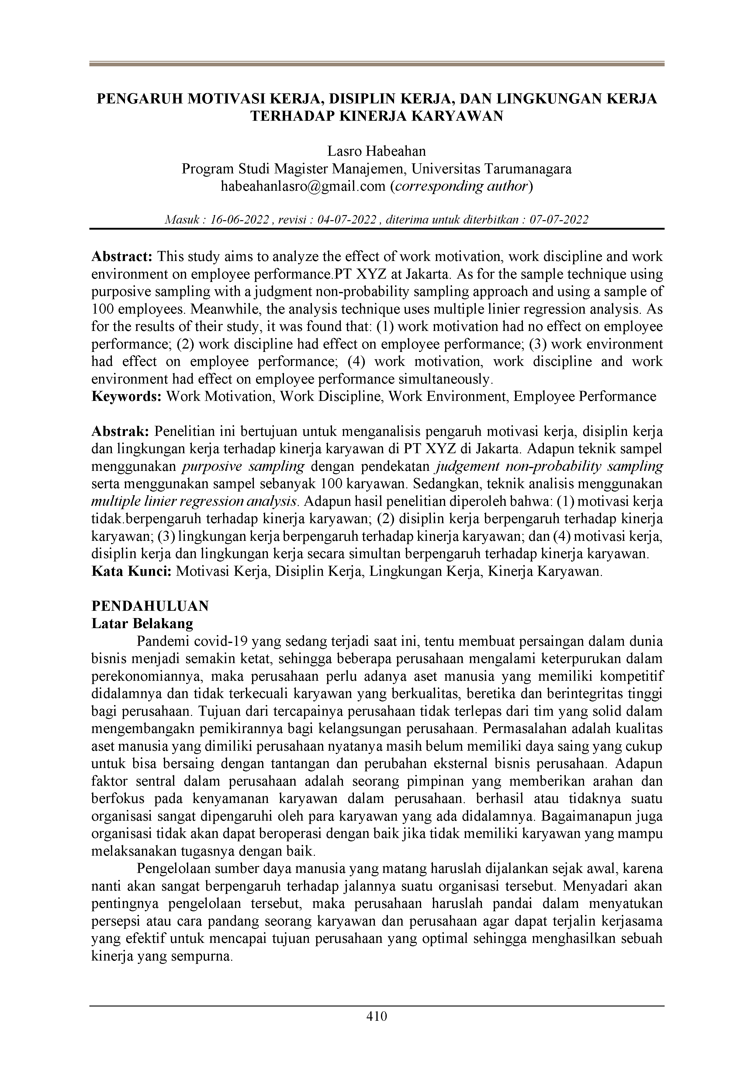 Penelitian ini bertujuan untuk menganalisis pengaruh motivasi kerja, disiplin kerja dan lingkungan kerja terhadap kinerja karyawan di PT XYZ di Jakarta. Adapun teknik sampel menggunakan purposive sampling dengan pendekatan judgement non-probability sampling serta menggunakan sampel sebanyak 100 karyawan. Sedangkan, teknik analisis menggunakan multiple linier regression analysis. Adapun hasil penelitian diperoleh bahwa: (1) motivasi kerja tidak.berpengaruh terhadap kinerja karyawan; (2) disiplin kerja berpengaruh terhadap kinerja karyawan; (3) lingkungan kerja berpengaruh terhadap kinerja karyawan; dan (4) motivasi kerja, disiplin kerja dan lingkungan kerja secara simultan berpengaruh terhadap kinerja karyawan.