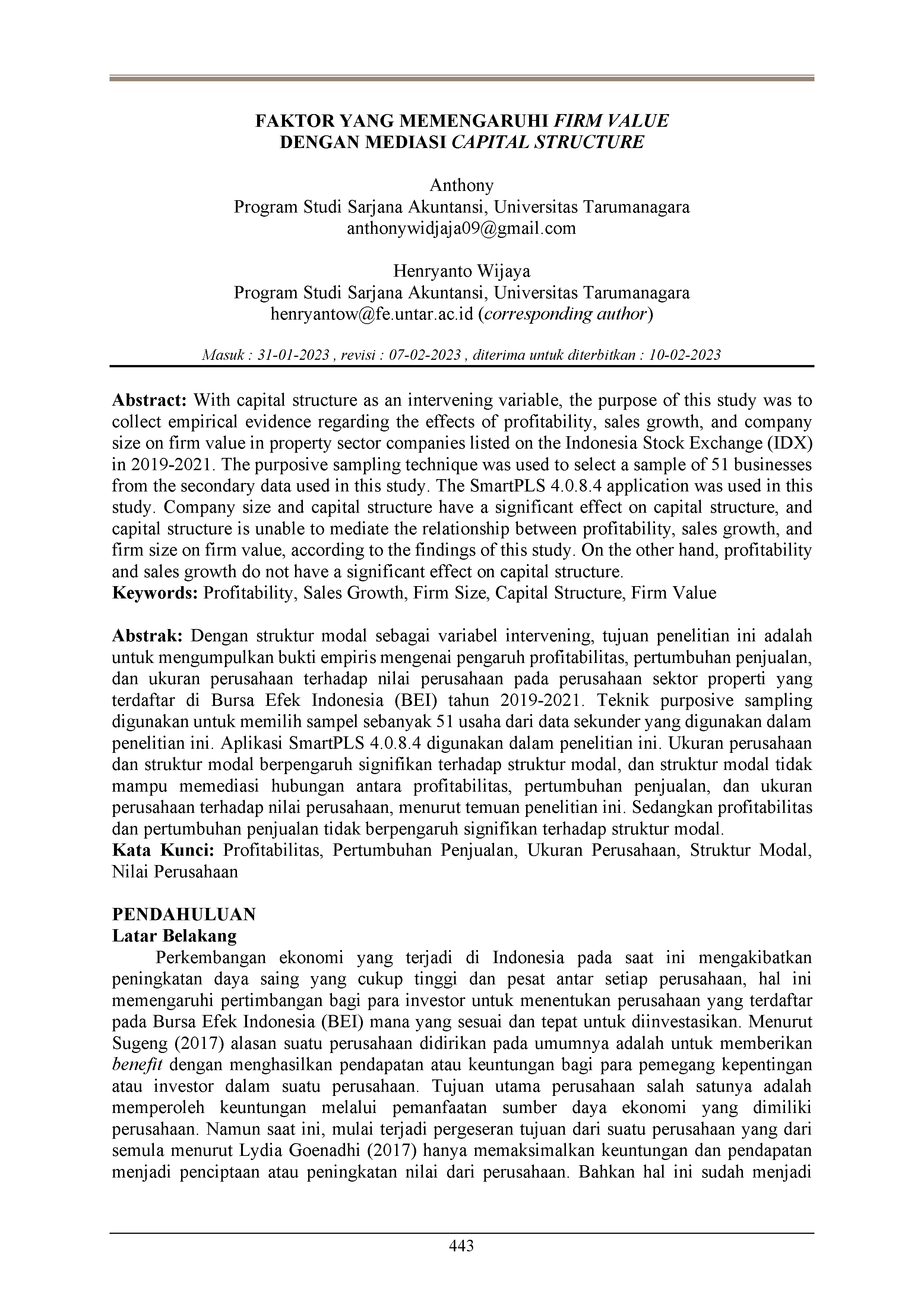 With capital structure as an intervening variable, the purpose of this study was to collect empirical evidence regarding the effects of profitability, sales growth, and company size on firm value in property sector companies listed on the Indonesia Stock Exchange (IDX) in 2019-2021. The purposive sampling technique was used to select a sample of 51 businesses from the secondary data used in this study. The SmartPLS 4.0.8.4 application was used in this study. Company size and capital structure have a significant effect on capital structure, and capital structure is unable to mediate the relationship between profitability, sales growth, and firm size on firm value, according to the findings of this study. On the other hand, profitability and sales growth do not have a significant effect on capital structure.