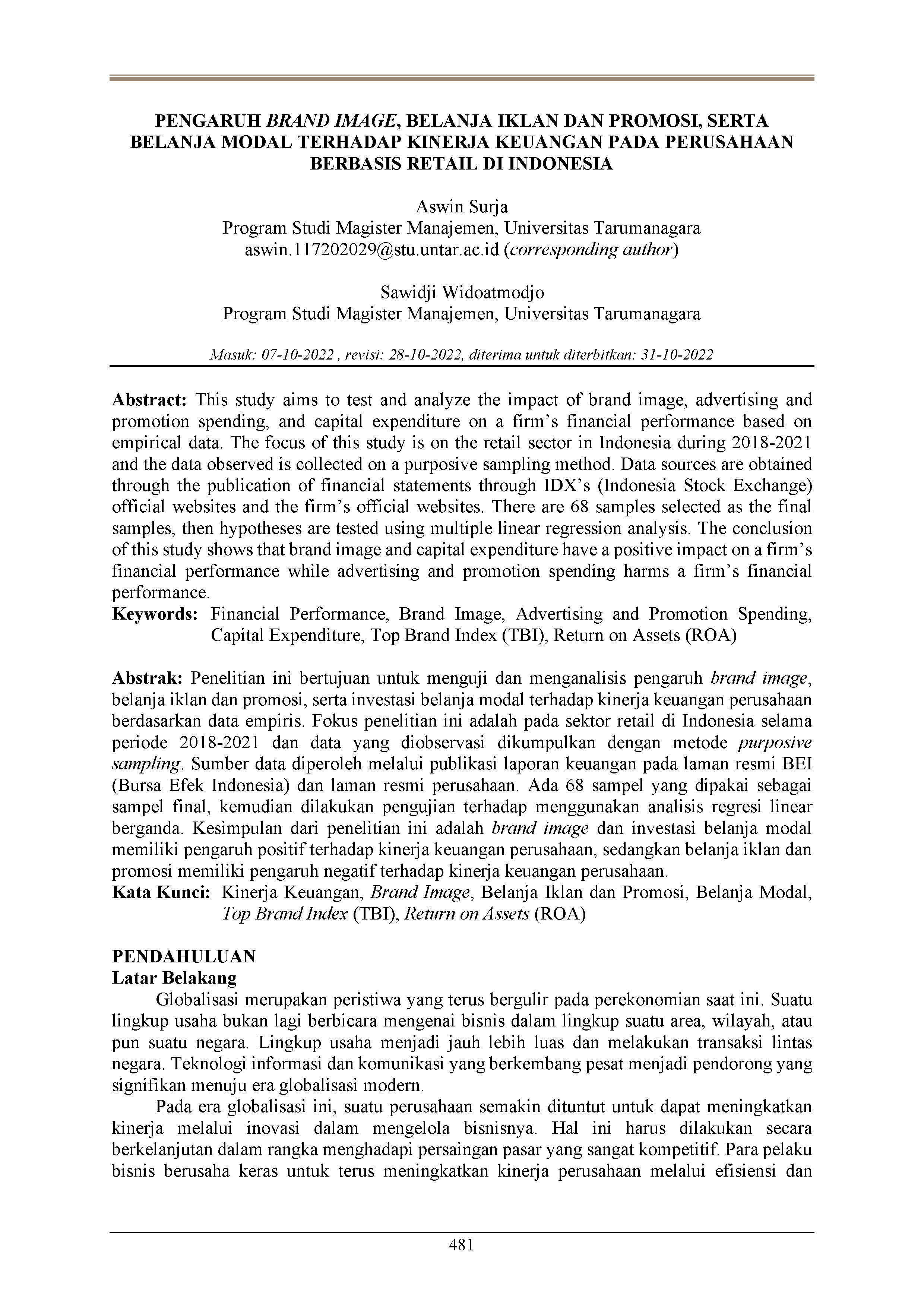 Pengaruh brand image, belanja iklan dan promosi, serta belanja modal terhadap kinerja keuangan pada perusahaan berbasis retail di Indonesia