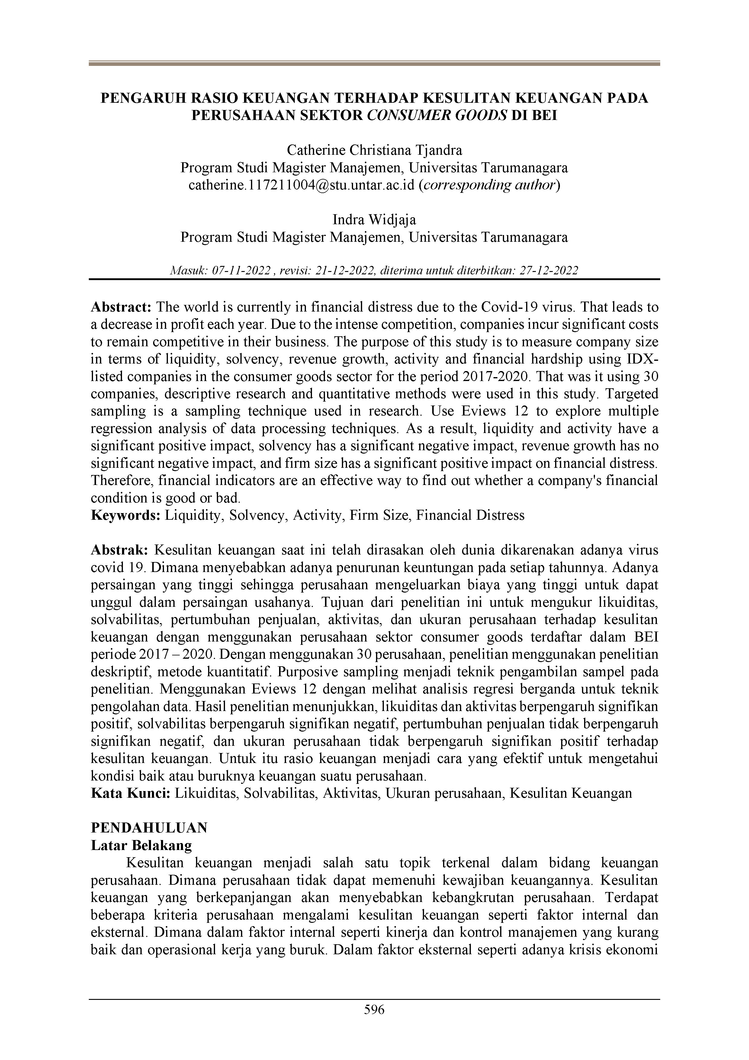 The world is currently in financial distress due to the Covid-19 virus. That leads to a decrease in profit each year. Due to the intense competition, companies incur significant costs to remain competitive in their business. The purpose of this study is to measure company size in terms of liquidity, solvency, revenue growth, activity and financial hardship using IDX-listed companies in the consumer goods sector for the period 2017-2020. That was it using 30 companies, descriptive research and quantitative methods were used in this study. Targeted sampling is a sampling technique used in research. Use Eviews 12 to explore multiple regression analysis of data processing techniques. As a result, liquidity and activity have a significant positive impact, solvency has a significant negative impact, revenue growth has no significant negative impact, and firm size has a significant positive impact on financial distress. Therefore, financial indicators are an effective way to find out whether a company's financial condition is good or bad.