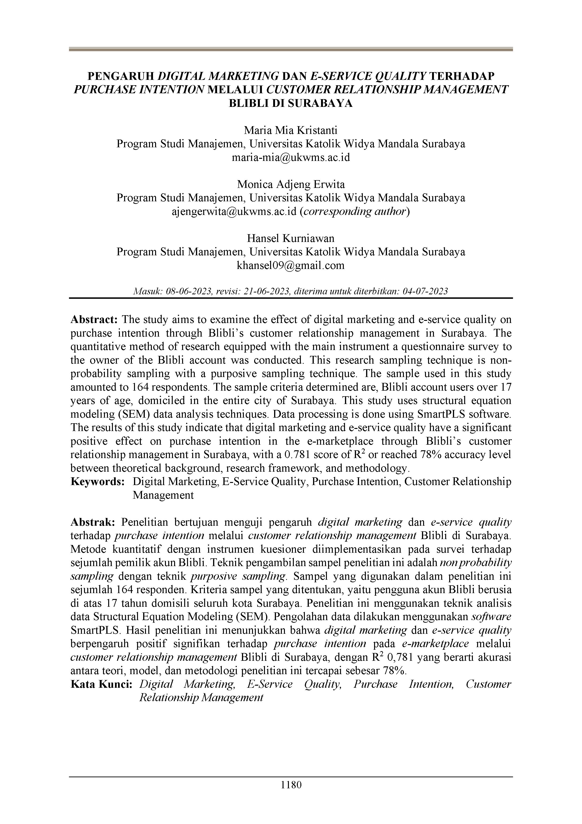 Pengaruh digital marketing dan e-service quality terhadap purchase intention melalui customer relationship management Blibli di Surabaya