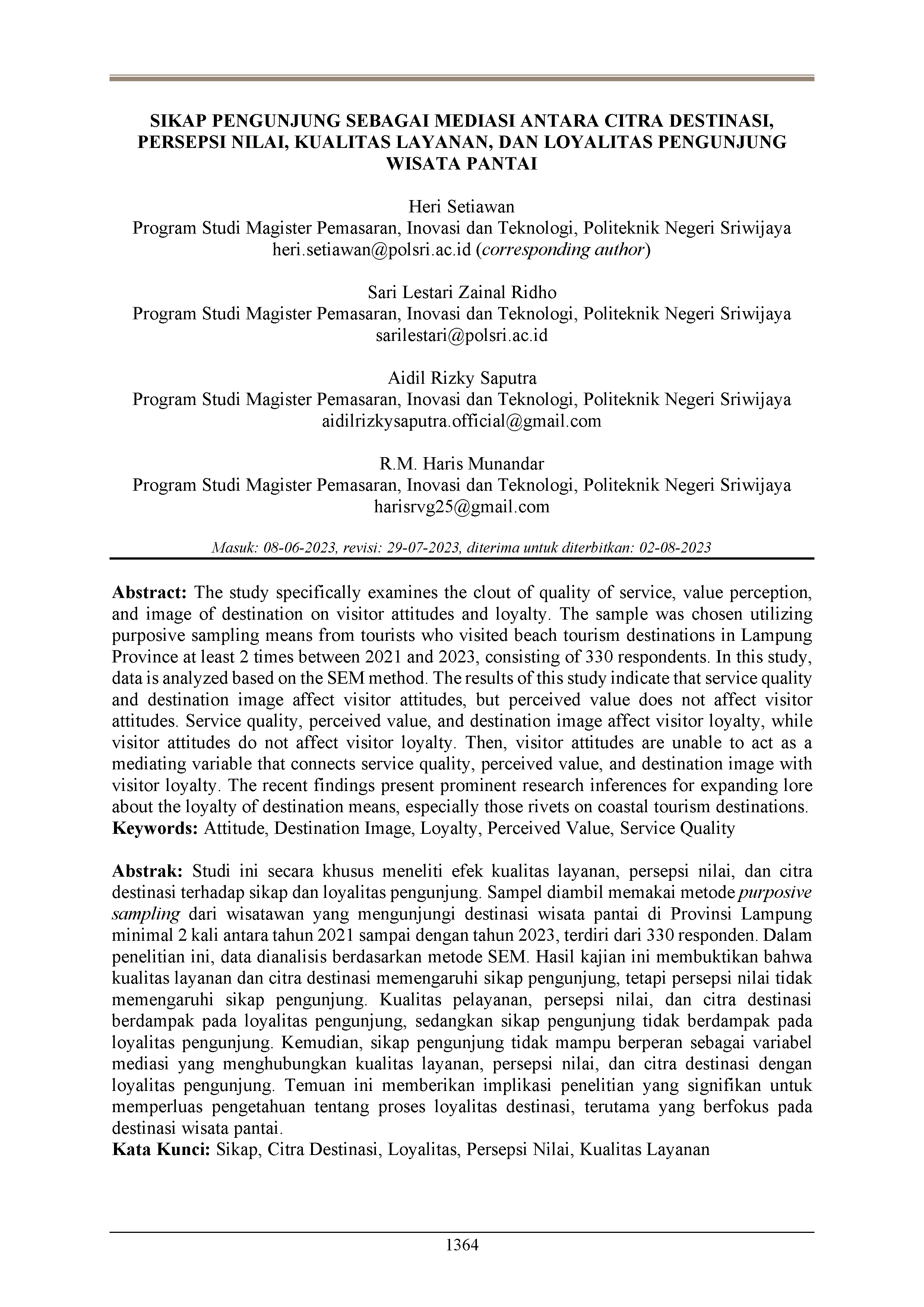 Studi ini secara khusus meneliti efek kualitas layanan, persepsi nilai, dan citra destinasi terhadap sikap dan loyalitas pengunjung. Sampel diambil memakai metode purposive sampling dari wisatawan yang mengunjungi destinasi wisata pantai di Provinsi Lampung minimal 2 kali antara tahun 2021 sampai dengan tahun 2023, terdiri dari 330 responden. Dalam penelitian ini, data dianalisis berdasarkan metode SEM. Hasil kajian ini membuktikan bahwa kualitas layanan dan citra destinasi memengaruhi sikap pengunjung, tetapi persepsi nilai tidak memengaruhi sikap pengunjung. Kualitas pelayanan, persepsi nilai, dan citra destinasi berdampak pada loyalitas pengunjung, sedangkan sikap pengunjung tidak berdampak pada loyalitas pengunjung. Kemudian, sikap pengunjung tidak mampu berperan sebagai variabel mediasi yang menghubungkan kualitas layanan, persepsi nilai, dan citra destinasi dengan loyalitas pengunjung. Temuan ini memberikan implikasi penelitian yang signifikan untuk memperluas pengetahuan tentang proses loyalitas destinasi, terutama yang berfokus pada destinasi wisata pantai.