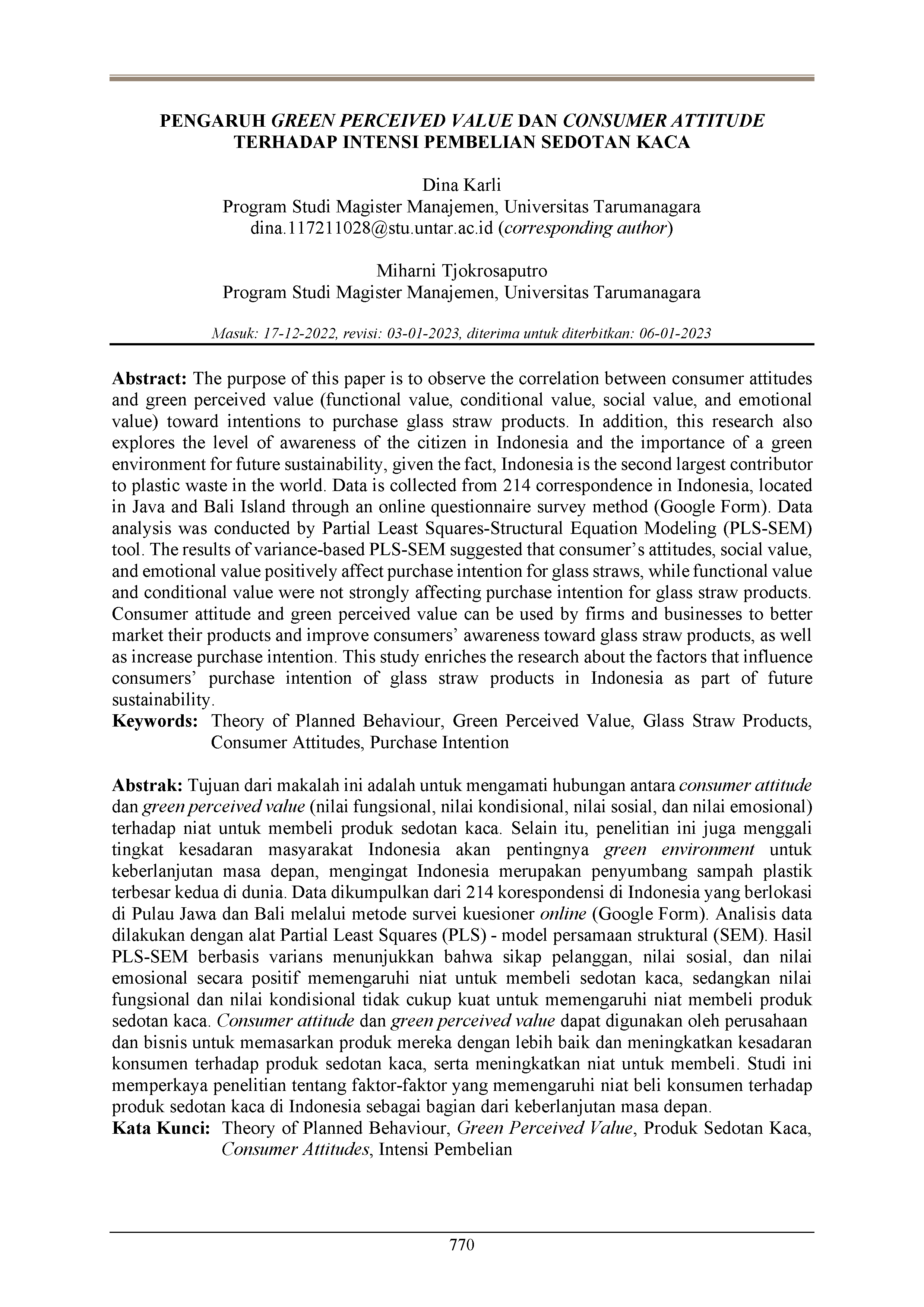 Tujuan dari makalah ini adalah untuk mengamati hubungan antara consumer attitude dan green perceived value (nilai fungsional, nilai kondisional, nilai sosial, dan nilai emosional) terhadap niat untuk membeli produk sedotan kaca. Selain itu, penelitian ini juga menggali tingkat kesadaran masyarakat Indonesia akan pentingnya green environment untuk keberlanjutan masa depan, mengingat Indonesia merupakan penyumbang sampah plastik terbesar kedua di dunia. Data dikumpulkan dari 214 korespondensi di Indonesia yang berlokasi di Pulau Jawa dan Bali melalui metode survei kuesioner online (Google Form). Analisis data dilakukan dengan alat Partial Least Squares (PLS) - model persamaan struktural (SEM). Hasil PLS-SEM berbasis varians menunjukkan bahwa sikap pelanggan, nilai sosial, dan nilai emosional secara positif memengaruhi niat untuk membeli sedotan kaca, sedangkan nilai fungsional dan nilai kondisional tidak cukup kuat untuk memengaruhi niat membeli produk sedotan kaca. Consumer attitude dan green perceived value dapat digunakan oleh perusahaan