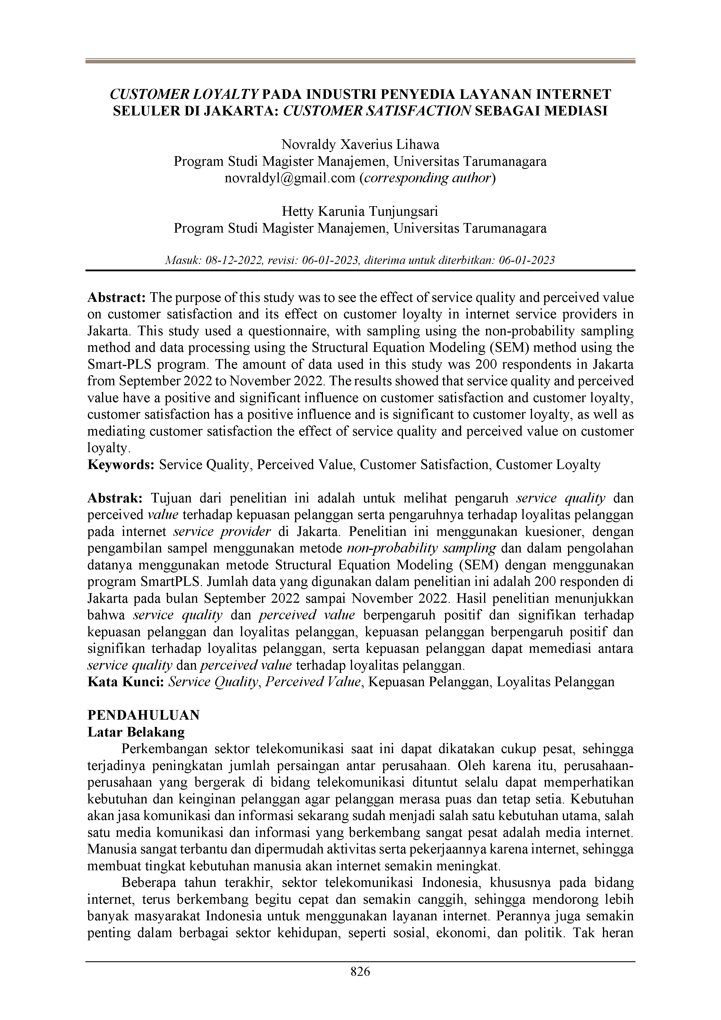 The purpose of this study was to see the effect of service quality and perceived value on customer satisfaction and its effect on customer loyalty in internet service providers in Jakarta. This study used a questionnaire, with sampling using the non-probability sampling method and data processing using the Structural Equation Modeling (SEM) method using the Smart-PLS program. The amount of data used in this study was 200 respondents in Jakarta from September 2022 to November 2022. The results showed that service quality and perceived value have a positive and significant influence on customer satisfaction and customer loyalty, customer satisfaction has a positive influence and is significant to customer loyalty, as well as mediating customer satisfaction the effect of service quality and perceived value on customer loyalty.