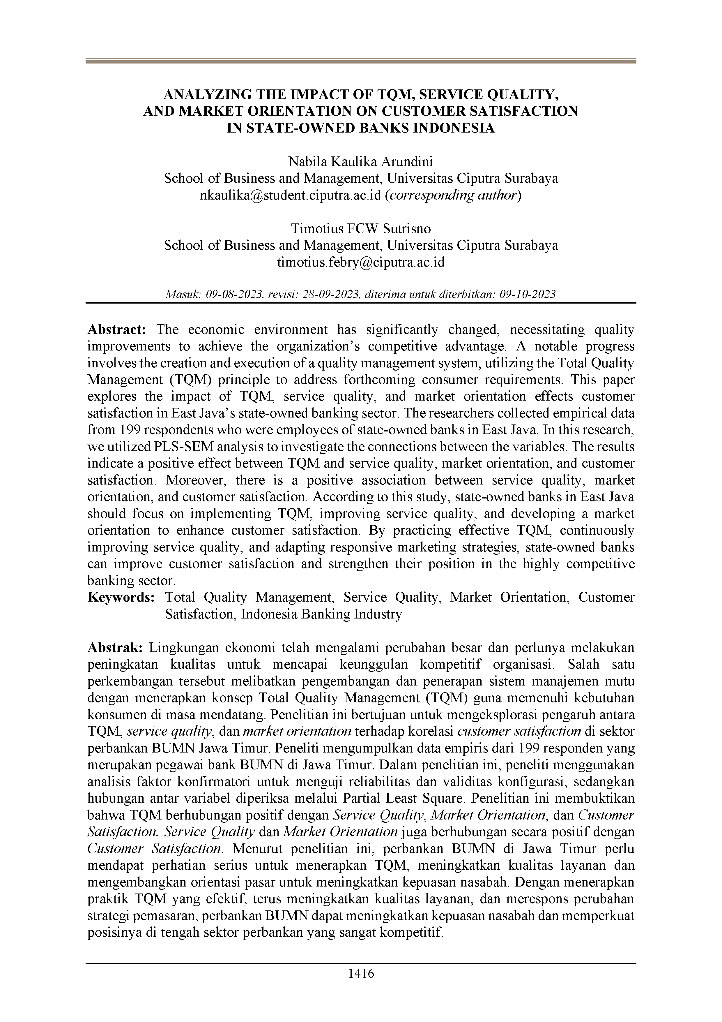 Lingkungan ekonomi telah mengalami perubahan besar dan perlunya melakukan peningkatan kualitas untuk mencapai keunggulan kompetitif organisasi. Salah satu perkembangan tersebut melibatkan pengembangan dan penerapan sistem manajemen mutu dengan menerapkan konsep Total Quality Management (TQM) guna memenuhi kebutuhan konsumen di masa mendatang. Penelitian ini bertujuan untuk mengeksplorasi pengaruh antara TQM, service quality, dan market orientation terhadap korelasi customer satisfaction di sektor perbankan BUMN Jawa Timur. Peneliti mengumpulkan data empiris dari 199 responden yang merupakan pegawai bank BUMN di Jawa Timur. Dalam penelitian ini, peneliti menggunakan analisis faktor konfirmatori untuk menguji reliabilitas dan validitas konfigurasi, sedangkan hubungan antar variabel diperiksa melalui Partial Least Square. Penelitian ini membuktikan bahwa TQM berhubungan positif dengan Service Quality, Market Orientation, dan Customer Satisfaction. Service Quality dan Market Orientation juga berhubungan secara positif dengan Customer Satisfaction. Menurut penelitian ini, perbankan BUMN di Jawa Timur perlu mendapat perhatian serius untuk menerapkan TQM, meningkatkan kualitas layanan dan mengembangkan orientasi pasar untuk meningkatkan kepuasan nasabah. Dengan menerapkan praktik TQM yang efektif, terus meningkatkan kualitas layanan, dan merespons perubahan strategi pemasaran, perbankan BUMN dapat meningkatkan kepuasan nasabah dan memperkuat posisinya di tengah sektor perbankan yang sangat kompetitif.
