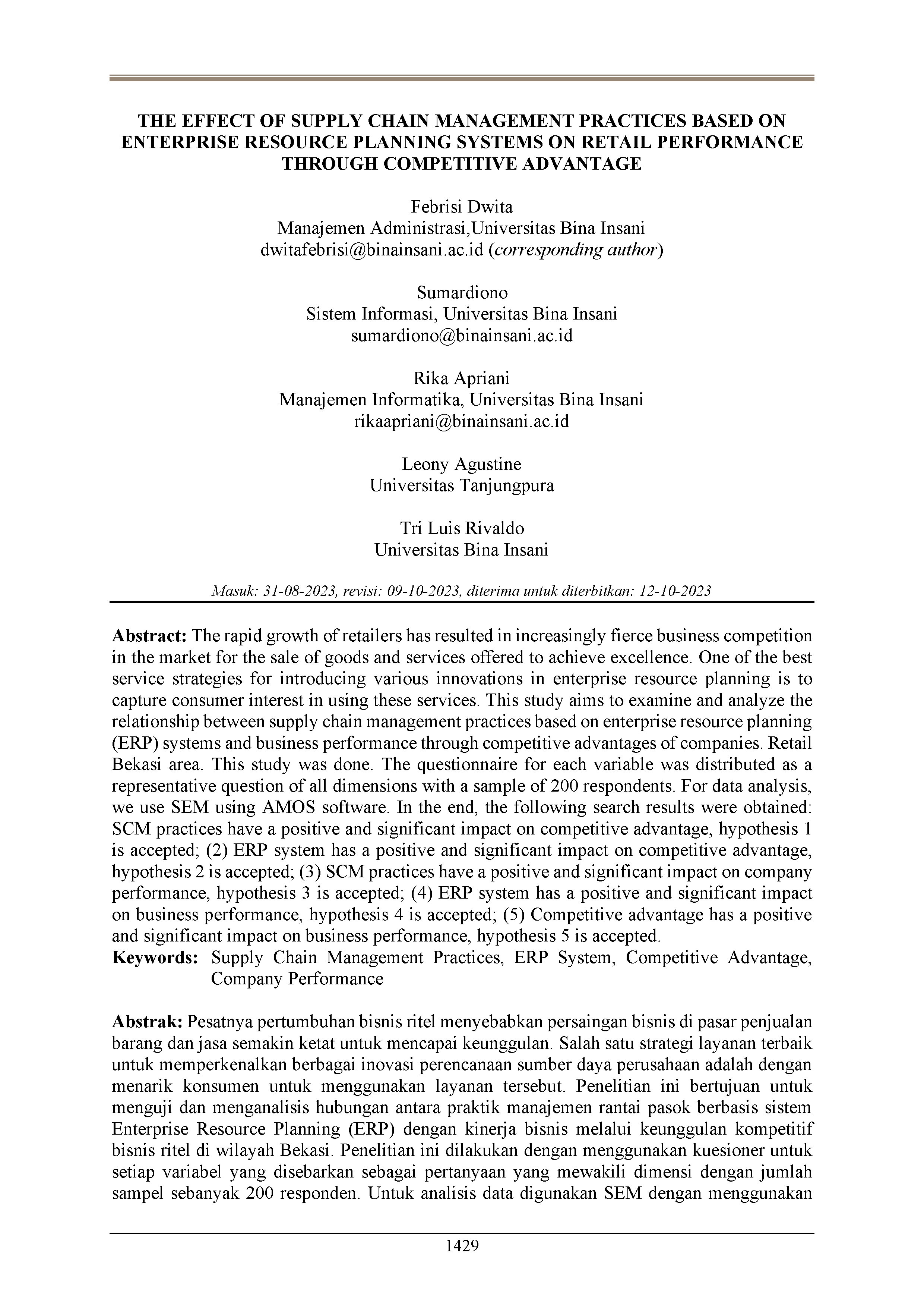 Pesatnya pertumbuhan bisnis ritel menyebabkan persaingan bisnis di pasar penjualan barang dan jasa semakin ketat untuk mencapai keunggulan. Salah satu strategi layanan terbaik untuk memperkenalkan berbagai inovasi perencanaan sumber daya perusahaan adalah dengan menarik konsumen untuk menggunakan layanan tersebut. Penelitian ini bertujuan untuk menguji dan menganalisis hubungan antara praktik manajemen rantai pasok berbasis sistem Enterprise Resource Planning (ERP) dengan kinerja bisnis melalui keunggulan kompetitif bisnis ritel di wilayah Bekasi. Penelitian ini dilakukan dengan menggunakan kuesioner untuk setiap variabel yang disebarkan sebagai pertanyaan yang mewakili dimensi dengan jumlah sampel sebanyak 200 responden. Untuk analisis data digunakan SEM dengan menggunakan software AMOS. Pada akhirnya diperoleh hasil pencarian sebagai berikut: (1) Praktik SCM berpengaruh positif dan signifikan terhadap keunggulan bersaing, hipotesis 1 diterima; (2) Sistem ERP berpengaruh positif dan signifikan terhadap keunggulan bersaing, hipotesis 2 diterima; (3) Praktik SCM berpengaruh positif dan signifikan terhadap kinerja perusahaan, hipotesis 3 diterima; (4) Sistem ERP berpengaruh positif dan signifikan terhadap kinerja bisnis, hipotesis 4 diterima; (5) Keunggulan kompetitif berpengaruh positif dan signifikan terhadap kinerja perusahaan, hipotesis 5 diterima.