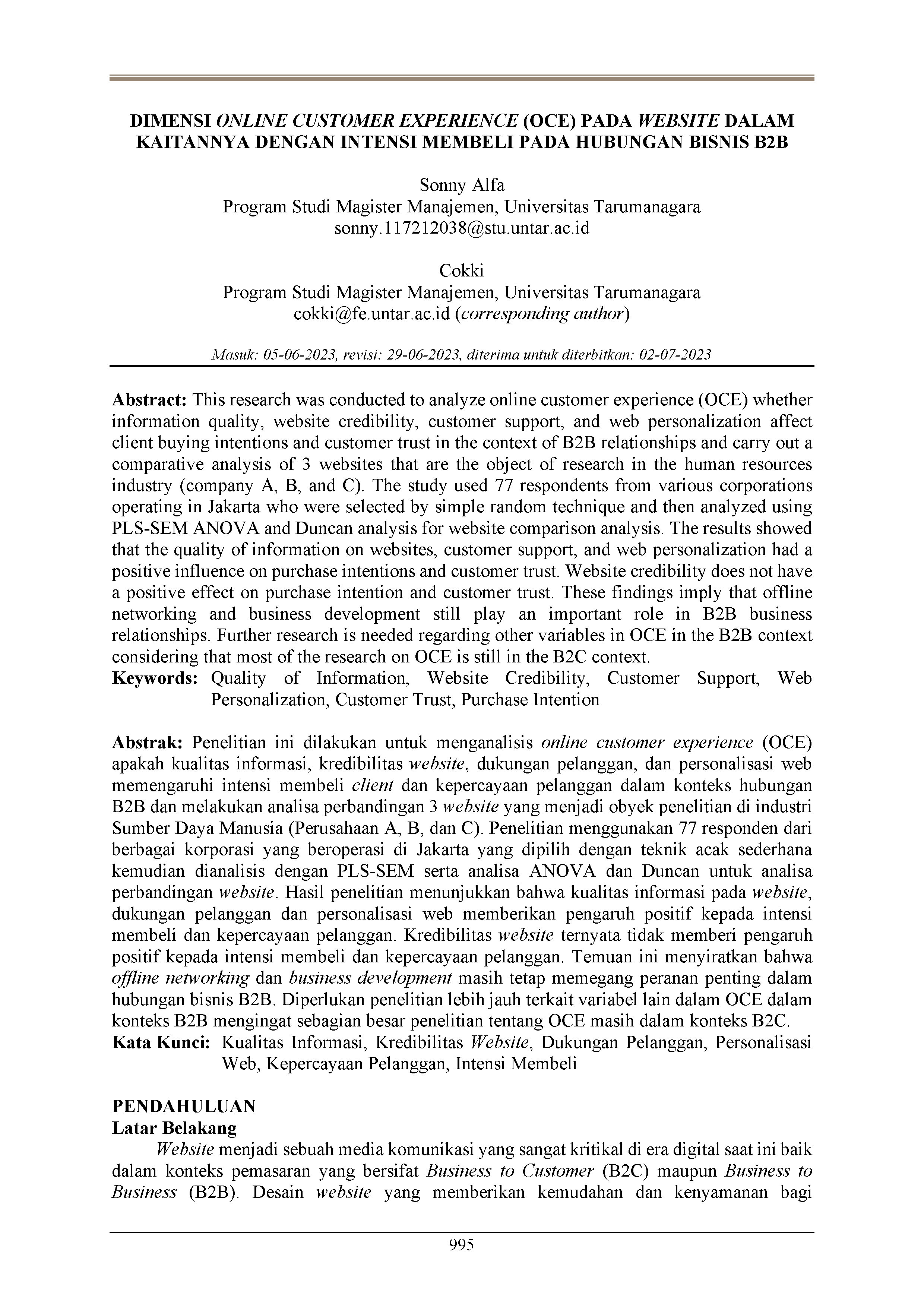 Penelitian ini dilakukan untuk menganalisis online customer experience (OCE) apakah kualitas informasi, kredibilitas website, dukungan pelanggan, dan personalisasi web memengaruhi intensi membeli client dan kepercayaan pelanggan dalam konteks hubungan B2B dan melakukan analisa perbandingan 3 website yang menjadi obyek penelitian di industri Sumber Daya Manusia (Perusahaan A, B, dan C). Penelitian menggunakan 77 responden dari berbagai korporasi yang beroperasi di Jakarta yang dipilih dengan teknik acak sederhana kemudian dianalisis dengan PLS-SEM serta analisa ANOVA dan Duncan untuk analisa perbandingan website. Hasil penelitian menunjukkan bahwa kualitas informasi pada website, dukungan pelanggan dan personalisasi web memberikan pengaruh positif kepada intensi membeli dan kepercayaan pelanggan. Kredibilitas website ternyata tidak memberi pengaruh positif kepada intensi membeli dan kepercayaan pelanggan. Temuan ini menyiratkan bahwa offline networking dan business development masih tetap memegang peranan penting dalam hubungan bisnis B2B. Diperlukan penelitian lebih jauh terkait variabel lain dalam OCE dalam konteks B2B mengingat sebagian besar penelitian tentang OCE masih dalam konteks B2C.
