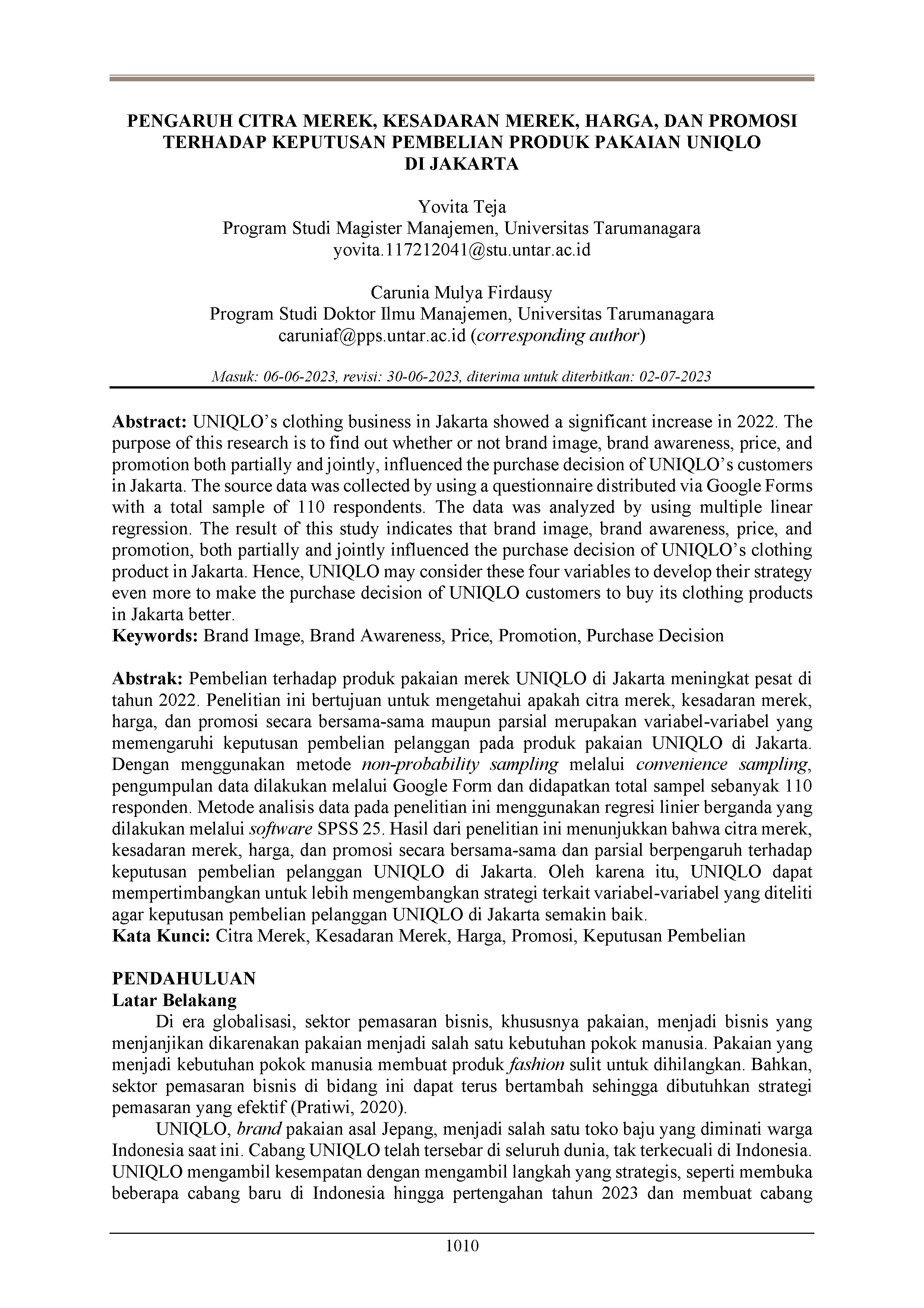 Pengaruh citra merek, kesadaran merek, harga, dan promosi terhadap keputusan pembelian produk pakaian UNIQLO di Jakarta