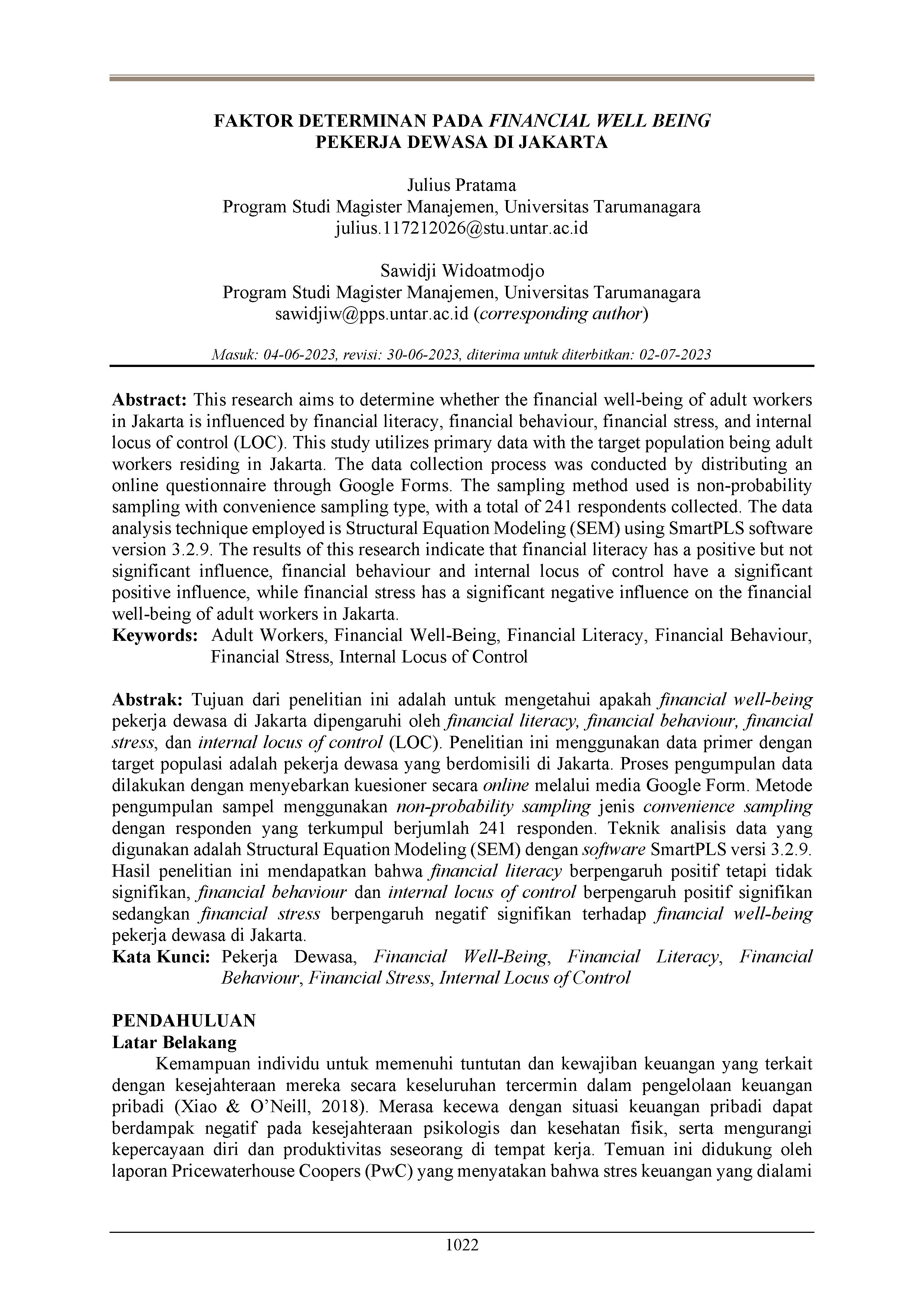 This research aims to determine whether the financial well-being of adult workers in Jakarta is influenced by financial literacy, financial behaviour, financial stress, and internal locus of control (LOC). This study utilizes primary data with the target population being adult workers residing in Jakarta. The data collection process was conducted by distributing an online questionnaire through Google Forms. The sampling method used is non-probability sampling with convenience sampling type, with a total of 241 respondents collected. The data analysis technique employed is Structural Equation Modeling (SEM) using SmartPLS software version 3.2.9. The results of this research indicate that financial literacy has a positive but not significant influence, financial behaviour and internal locus of control have a significant positive influence, while financial stress has a significant negative influence on the financial well-being of adult workers in Jakarta.