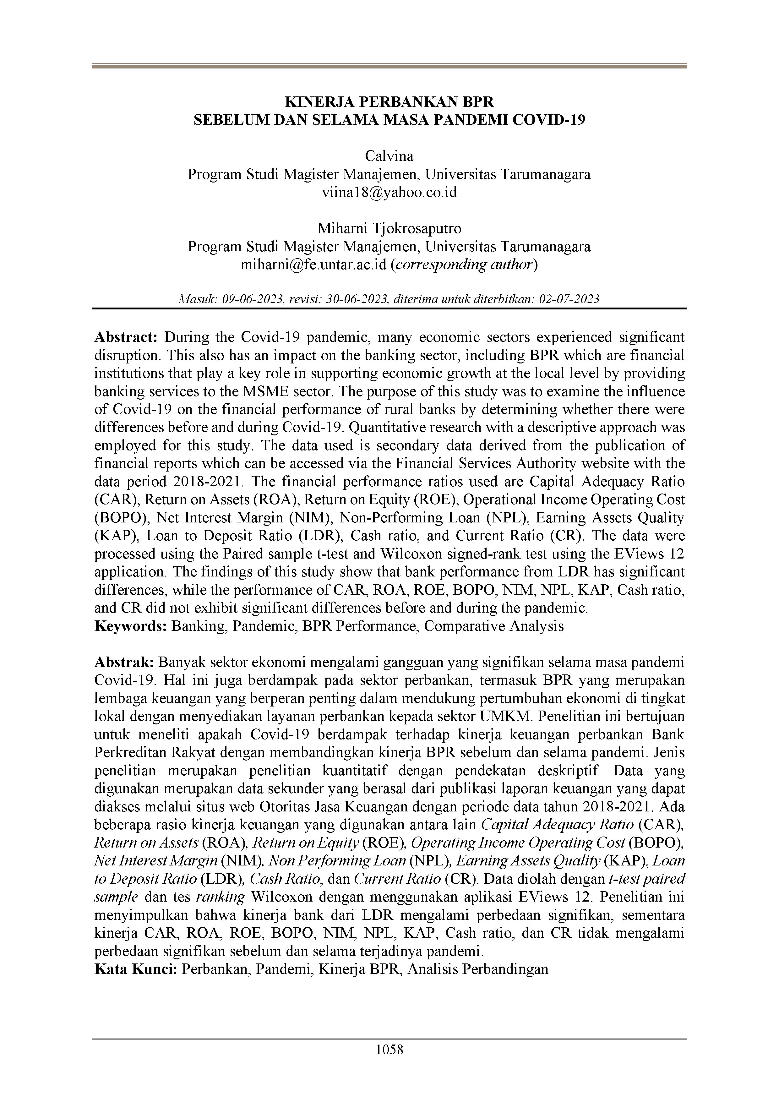 Calvina, C., & Miharni. (2023). Kinerja perbankan BPR sebelum dan selama masa pandemi Covid-19. Jurnal Manajemen Bisnis Dan Kewirausahaan, 7(5), 1058–1071. https://doi.org/10.24912/jmbk.v7i5.26506