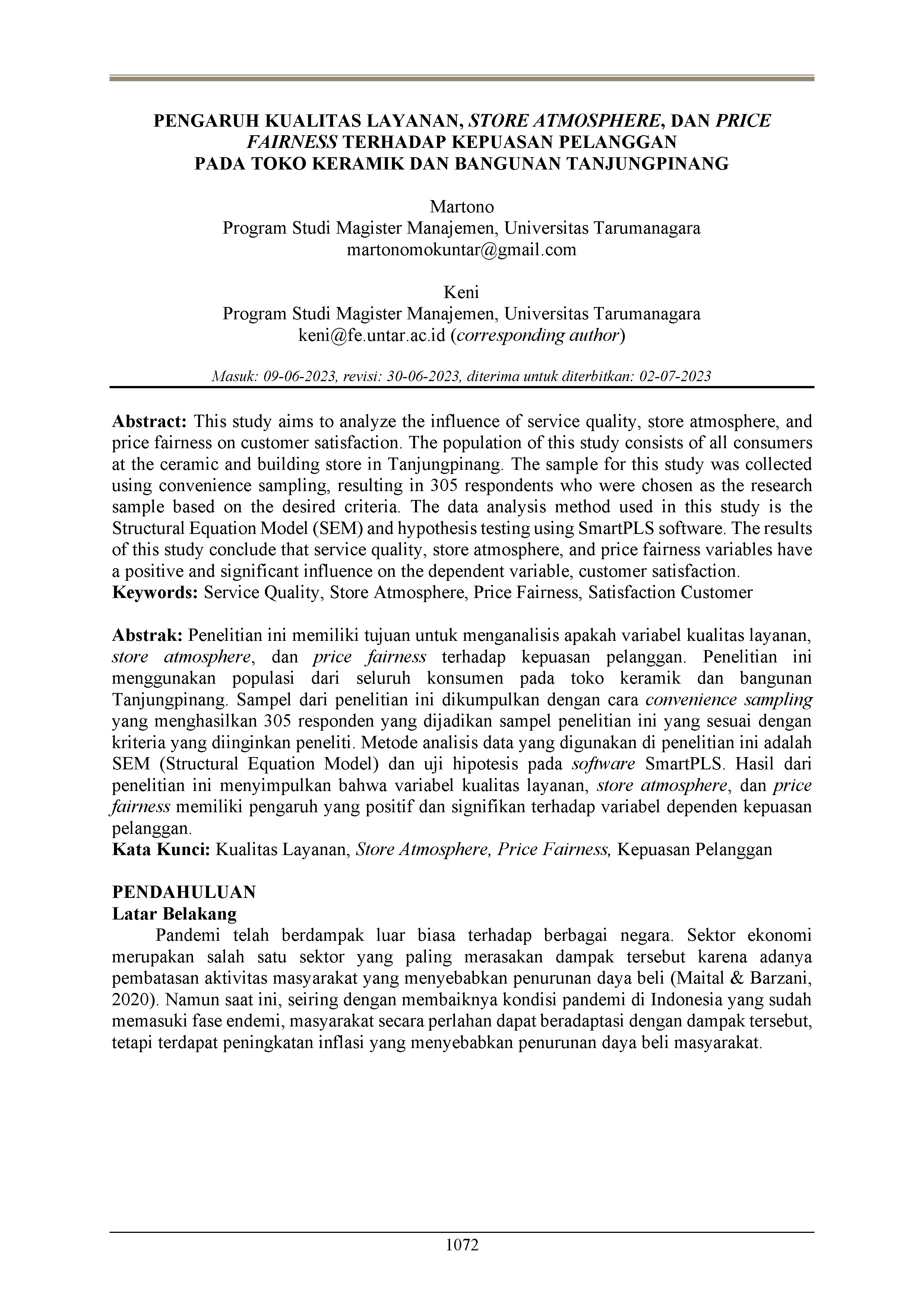 Pengaruh kualitas layanan, store atmosphere, dan price fairness terhadap kepuasan pelanggan pada toko keramik dan bangunan Tanjungpinang