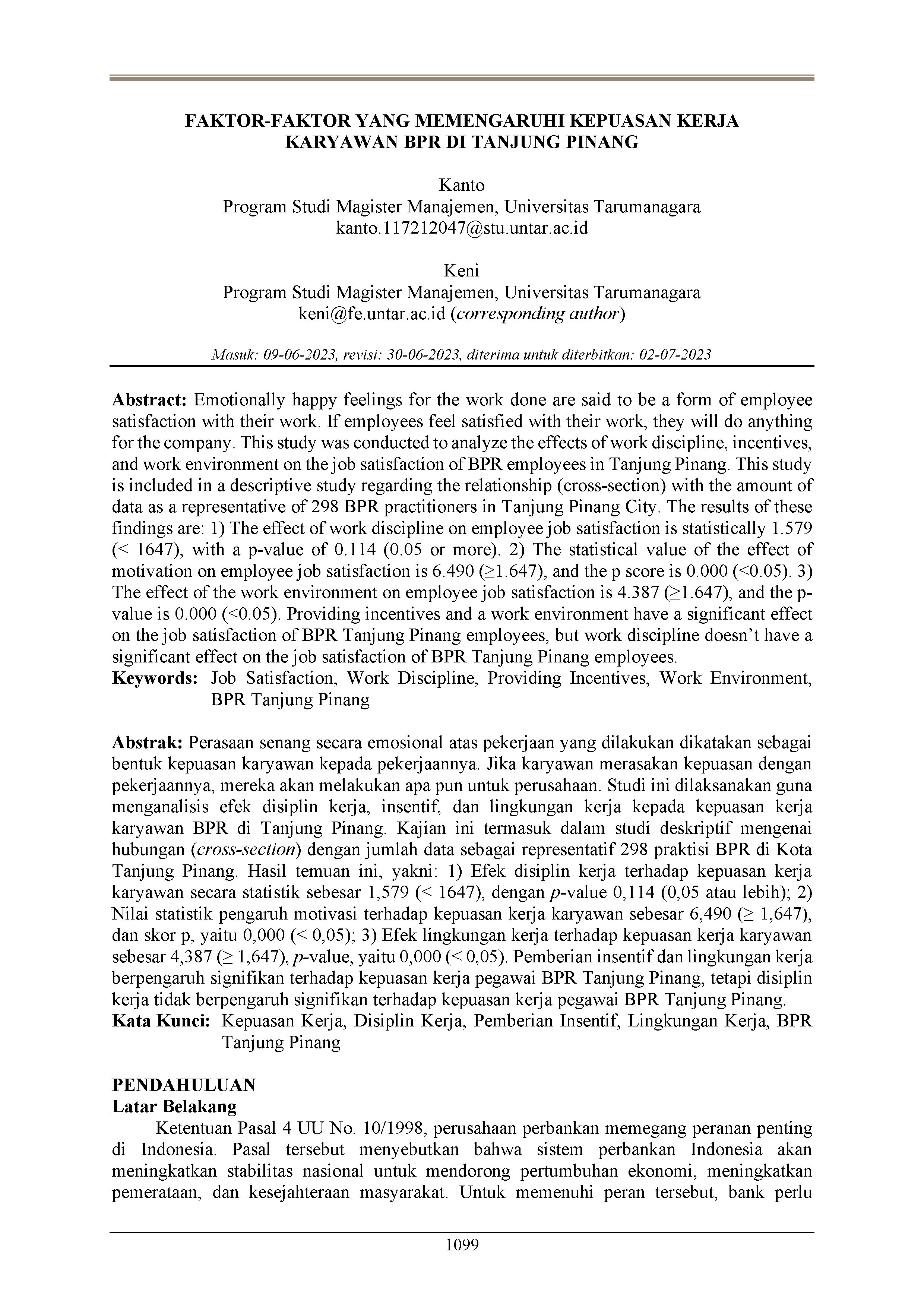 Faktor-faktor yang memengaruhi kepuasan kerja karyawan BPR di Tanjung Pinang