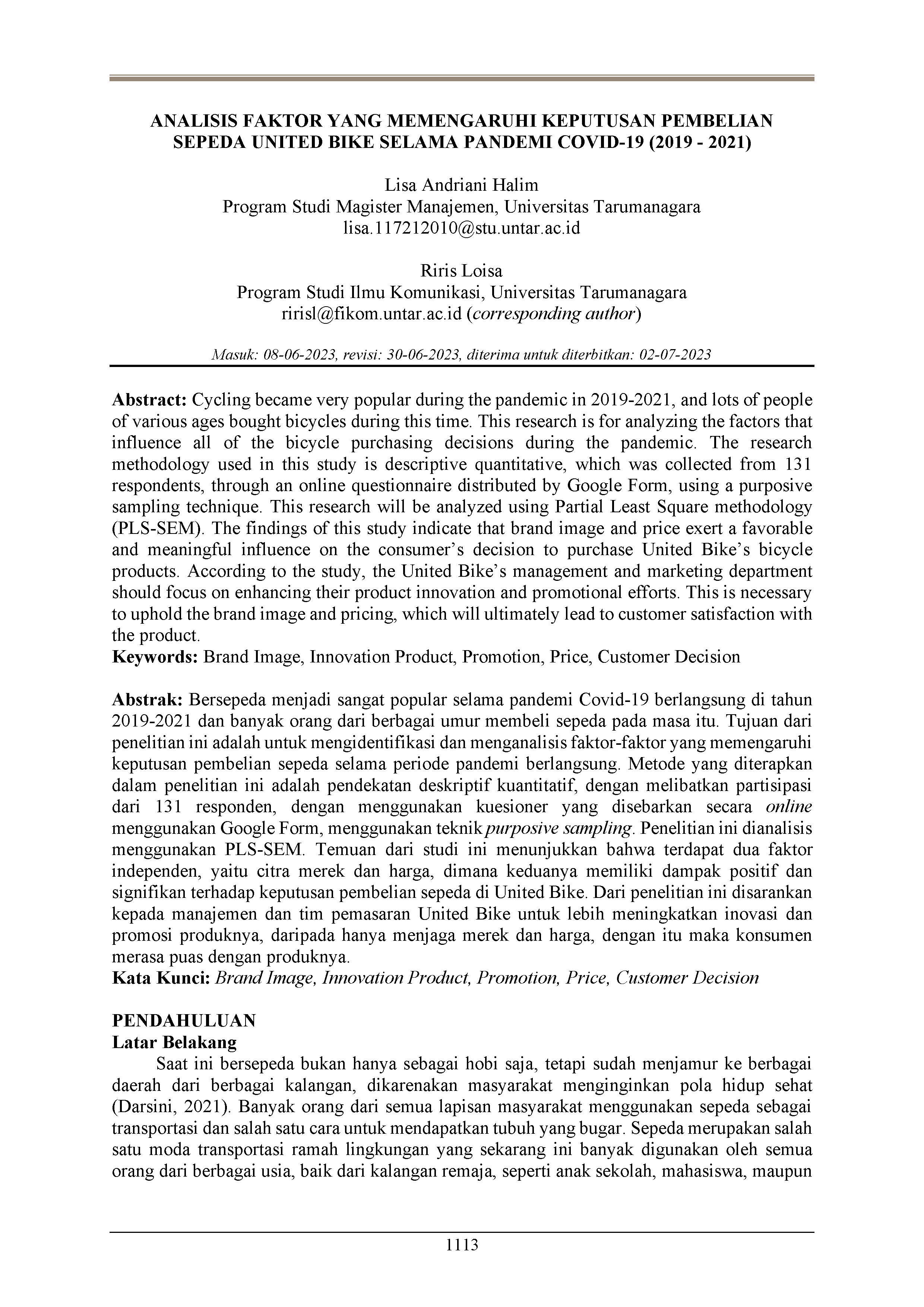 Bersepeda menjadi sangat popular selama pandemi Covid-19 berlangsung di tahun 2019-2021 dan banyak orang dari berbagai umur membeli sepeda pada masa itu. Tujuan dari penelitian ini adalah untuk mengidentifikasi dan menganalisis faktor-faktor yang memengaruhi keputusan pembelian sepeda selama periode pandemi berlangsung. Metode yang diterapkan dalam penelitian ini adalah pendekatan deskriptif kuantitatif, dengan melibatkan partisipasi dari 131 responden, dengan menggunakan kuesioner yang disebarkan secara online menggunakan Google Form, menggunakan teknik purposive sampling. Penelitian ini dianalisis menggunakan PLS-SEM. Temuan dari studi ini menunjukkan bahwa terdapat dua faktor independen, yaitu citra merek dan harga, dimana keduanya memiliki dampak positif dan signifikan terhadap keputusan pembelian sepeda di United Bike. Dari penelitian ini disarankan kepada manajemen dan tim pemasaran United Bike untuk lebih meningkatkan inovasi dan promosi produknya, daripada hanya menjaga merek dan harga, dengan itu maka konsumen merasa puas dengan produknya.