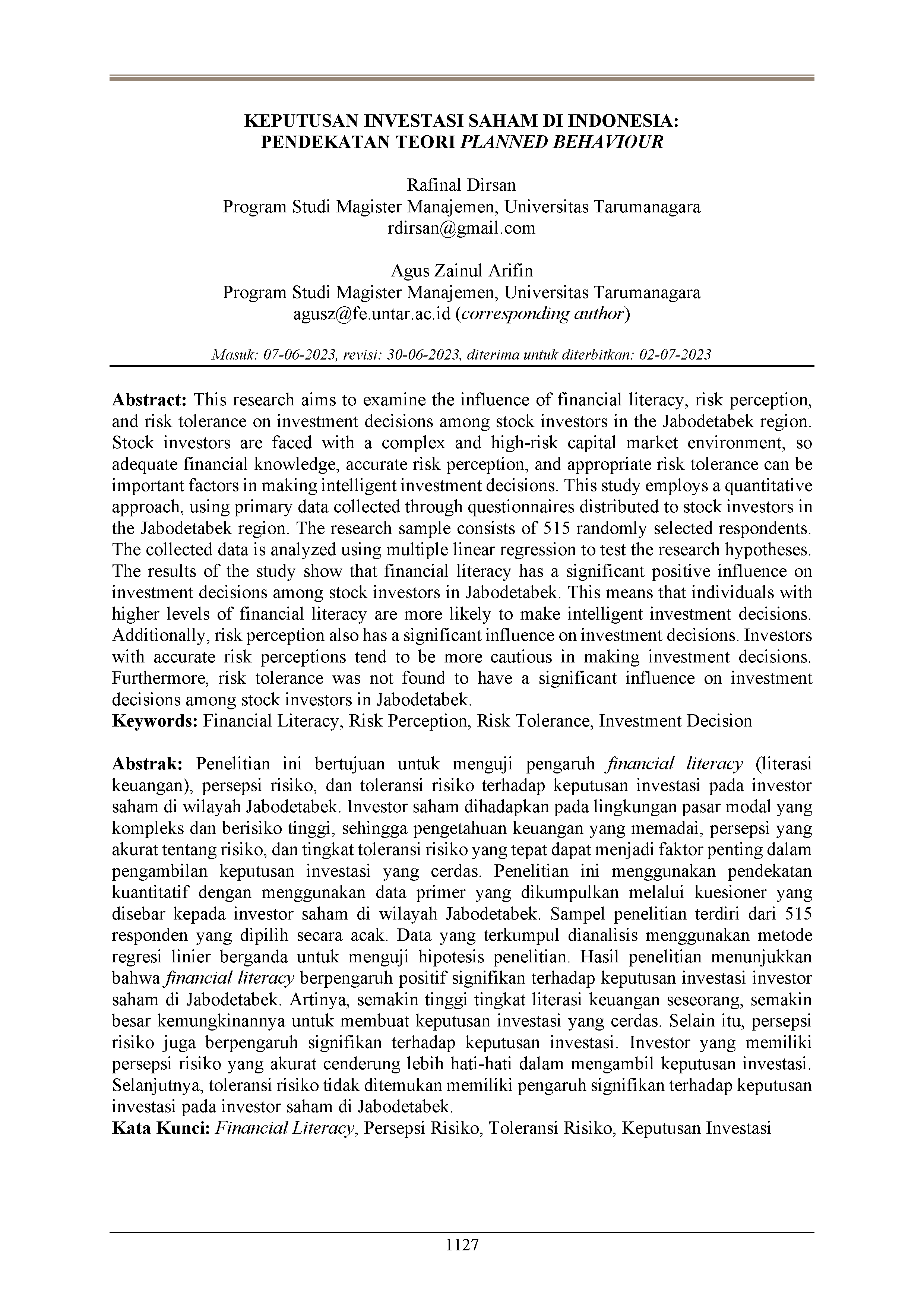 This research aims to examine the influence of financial literacy, risk perception, and risk tolerance on investment decisions among stock investors in the Jabodetabek region. Stock investors are faced with a complex and high-risk capital market environment, so adequate financial knowledge, accurate risk perception, and appropriate risk tolerance can be important factors in making intelligent investment decisions. This study employs a quantitative approach, using primary data collected through questionnaires distributed to stock investors in the Jabodetabek region. The research sample consists of 515 randomly selected respondents. The collected data is analyzed using multiple linear regression to test the research hypotheses. The results of the study show that financial literacy has a significant positive influence on investment decisions among stock investors in Jabodetabek. This means that individuals with higher levels of financial literacy are more likely to make intelligent investment decisions. Additionally, risk perception also has a significant influence on investment decisions. Investors with accurate risk perceptions tend to be more cautious in making investment decisions. Furthermore, risk tolerance was not found to have a significant influence on investment decisions among stock investors in Jabodetabek.