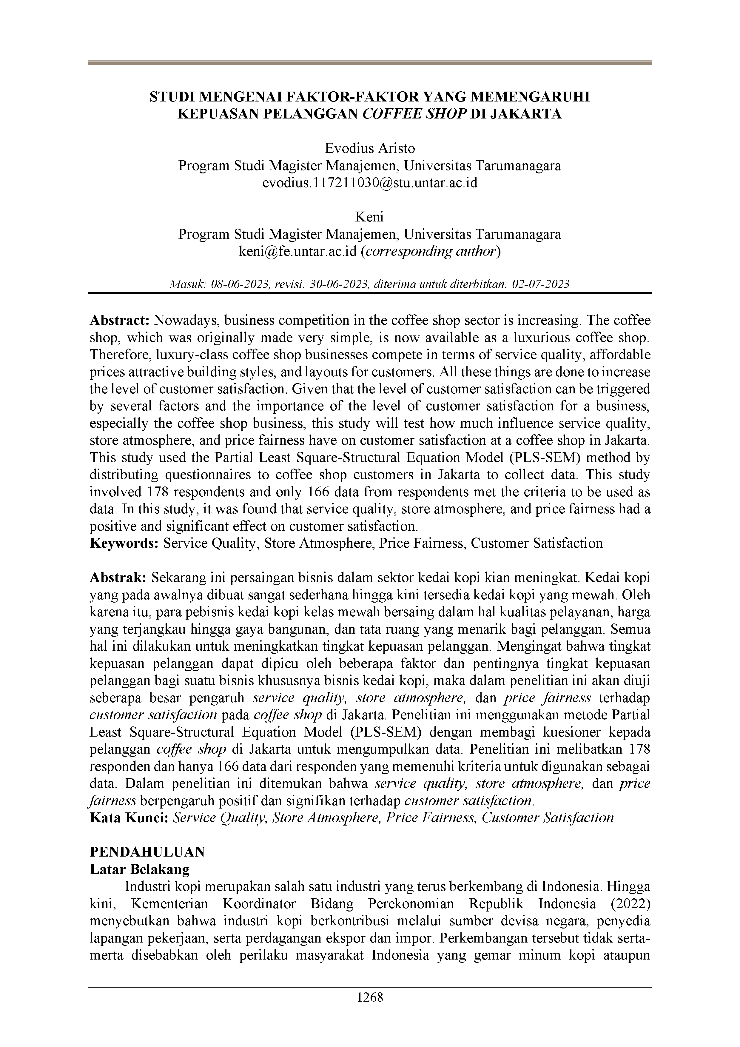 Sekarang ini persaingan bisnis dalam sektor kedai kopi kian meningkat. Kedai kopi yang pada awalnya dibuat sangat sederhana hingga kini tersedia kedai kopi yang mewah. Oleh karena itu, para pebisnis kedai kopi kelas mewah bersaing dalam hal kualitas pelayanan, harga yang terjangkau hingga gaya bangunan, dan tata ruang yang menarik bagi pelanggan. Semua hal ini dilakukan untuk meningkatkan tingkat kepuasan pelanggan. Mengingat bahwa tingkat kepuasan pelanggan dapat dipicu oleh beberapa faktor dan pentingnya tingkat kepuasan pelanggan bagi suatu bisnis khususnya bisnis kedai kopi, maka dalam penelitian ini akan diuji seberapa besar pengaruh service quality, store atmosphere, dan price fairness terhadap customer satisfaction pada coffee shop di Jakarta. Penelitian ini menggunakan metode Partial Least Square-Structural Equation Model (PLS-SEM) dengan membagi kuesioner kepada pelanggan coffee shop di Jakarta untuk mengumpulkan data. Penelitian ini melibatkan 178 responden dan hanya 166 data dari responden yang memenuhi kriteria untuk digunakan sebagai data. Dalam penelitian ini ditemukan bahwa service quality, store atmosphere, dan price fairness berpengaruh positif dan signifikan terhadap customer satisfaction.