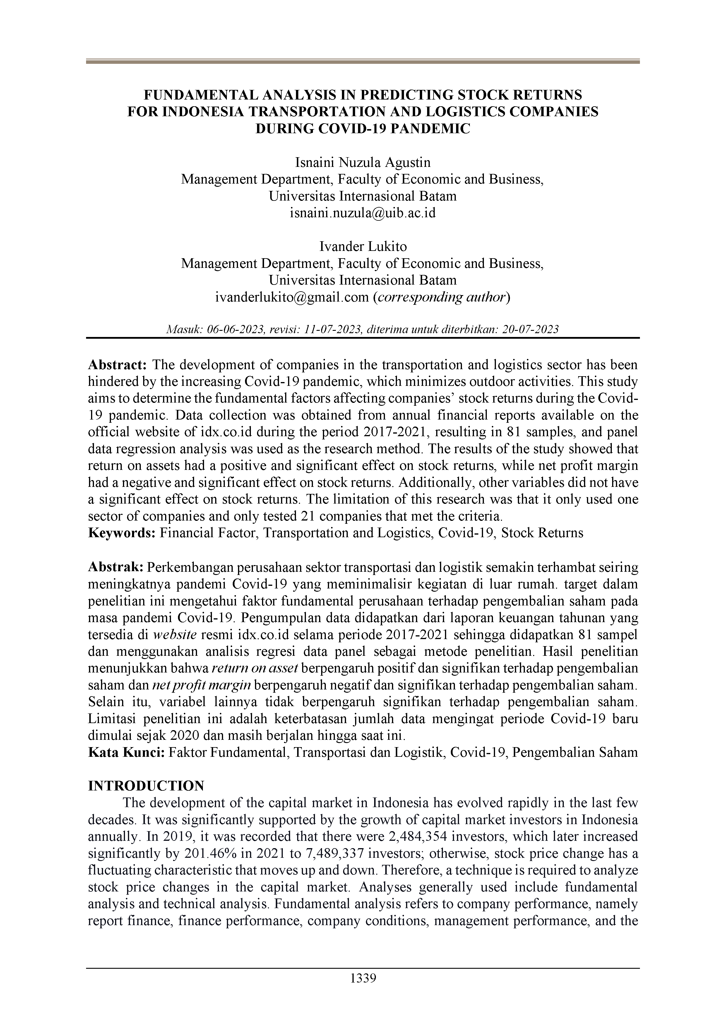 Fundamental analysis in predicting stock returns for Indonesia transportation and logistics companies during Covid-19 pandemic