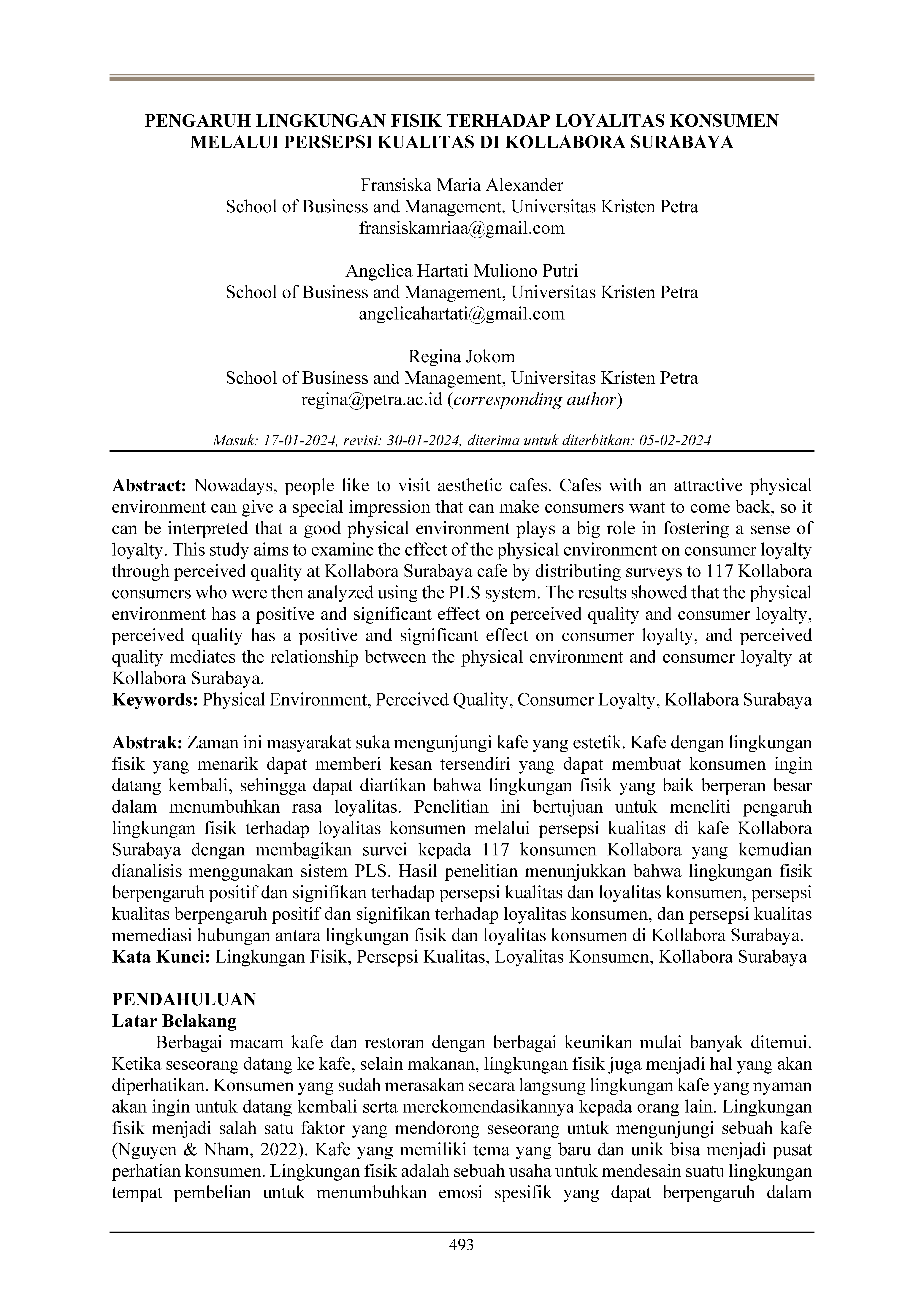 Zaman ini masyarakat suka mengunjungi kafe yang estetik. Kafe dengan lingkungan fisik yang menarik dapat memberi kesan tersendiri yang dapat membuat konsumen ingin datang kembali, sehingga dapat diartikan bahwa lingkungan fisik yang baik berperan besar dalam menumbuhkan rasa loyalitas. Penelitian ini bertujuan untuk meneliti pengaruh lingkungan fisik terhadap loyalitas konsumen melalui persepsi kualitas di kafe Kollabora Surabaya dengan membagikan survei kepada 117 konsumen Kollabora yang kemudian dianalisis menggunakan sistem PLS. Hasil penelitian menunjukkan bahwa lingkungan fisik berpengaruh positif dan signifikan terhadap persepsi kualitas dan loyalitas konsumen, persepsi kualitas berpengaruh positif dan signifikan terhadap loyalitas konsumen, dan persepsi kualitas memediasi hubungan antara lingkungan fisik dan loyalitas konsumen di Kollabora Surabaya.