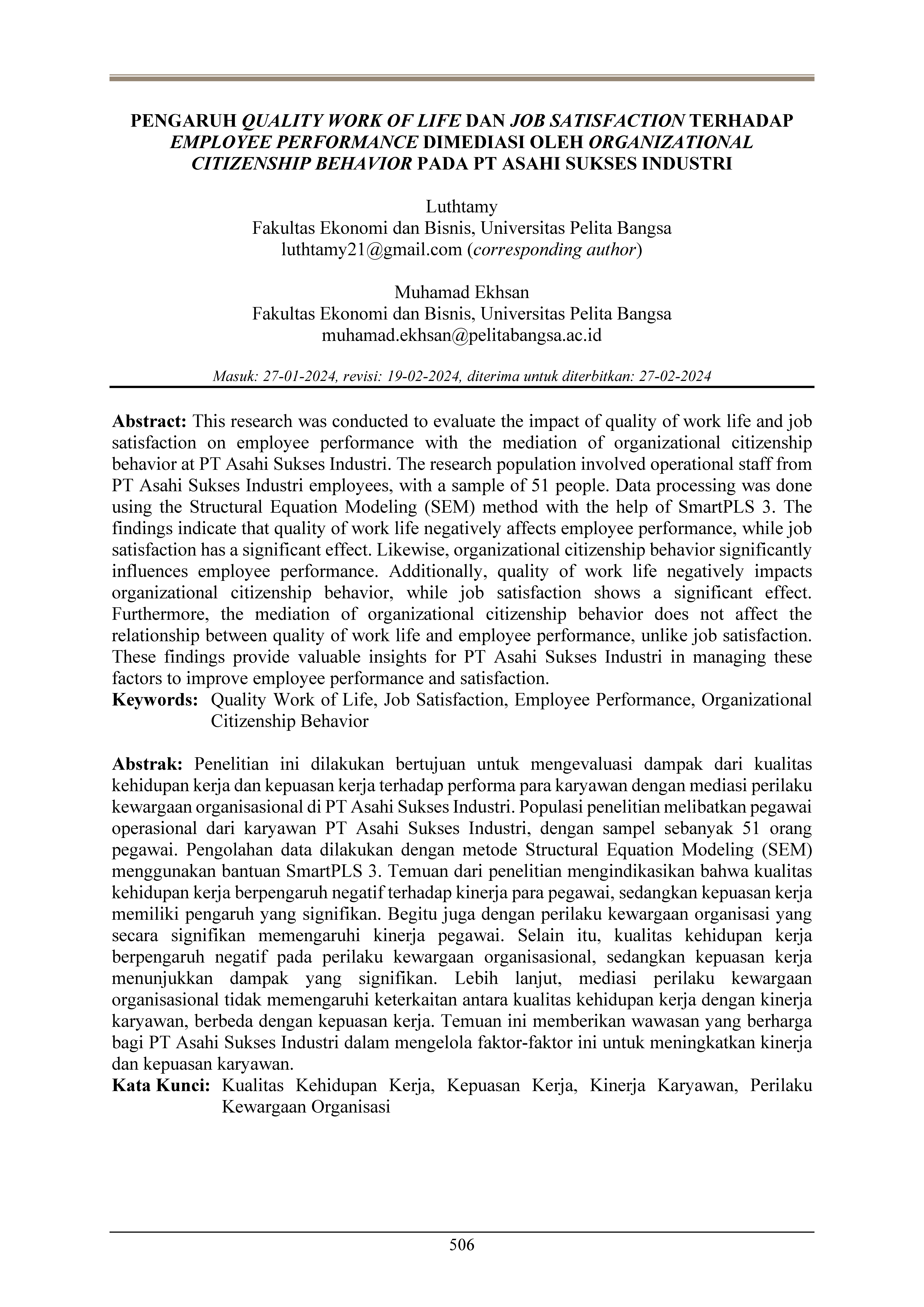 Pengaruh quality work of life dan job satisfaction terhadap employee performance dimediasi oleh organizational citizenship behavior pada PT Asahi Sukses Industri
