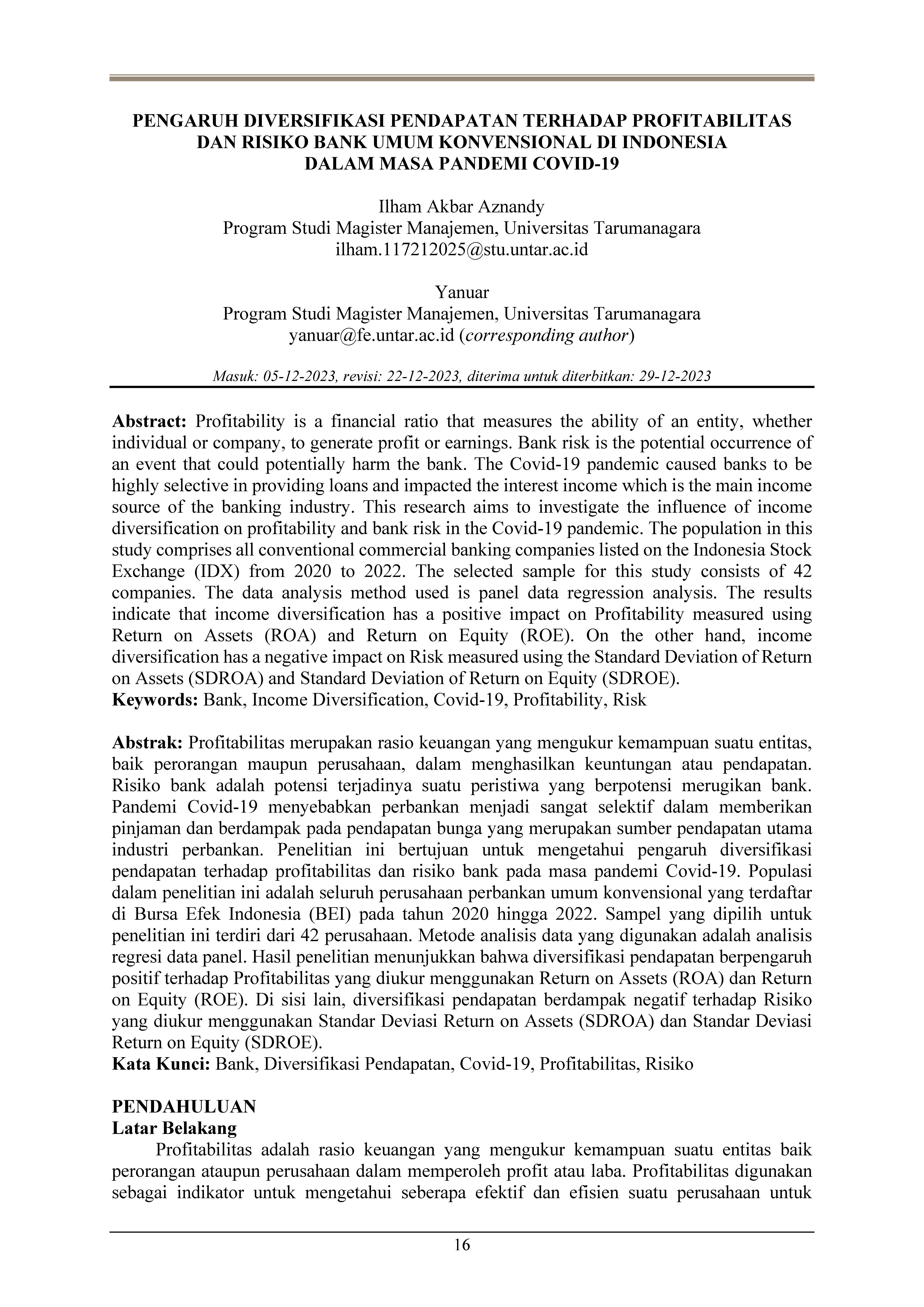 Profitabilitas merupakan rasio keuangan yang mengukur kemampuan suatu entitas, baik perorangan maupun perusahaan, dalam menghasilkan keuntungan atau pendapatan. Risiko bank adalah potensi terjadinya suatu peristiwa yang berpotensi merugikan bank. Pandemi Covid-19 menyebabkan perbankan menjadi sangat selektif dalam memberikan pinjaman dan berdampak pada pendapatan bunga yang merupakan sumber pendapatan utama industri perbankan. Penelitian ini bertujuan untuk mengetahui pengaruh diversifikasi pendapatan terhadap profitabilitas dan risiko bank pada masa pandemi Covid-19. Populasi dalam penelitian ini adalah seluruh perusahaan perbankan umum konvensional yang terdaftar di Bursa Efek Indonesia (BEI) pada tahun 2020 hingga 2022. Sampel yang dipilih untuk penelitian ini terdiri dari 42 perusahaan. Metode analisis data yang digunakan adalah analisis regresi data panel. Hasil penelitian menunjukkan bahwa diversifikasi pendapatan berpengaruh positif terhadap Profitabilitas yang diukur menggunakan Return on Assets (ROA) dan Return on Equity (ROE). Di sisi lain, diversifikasi pendapatan berdampak negatif terhadap Risiko yang diukur menggunakan Standar Deviasi Return on Assets (SDROA) dan Standar Deviasi Return on Equity (SDROE).